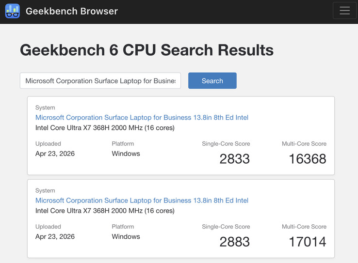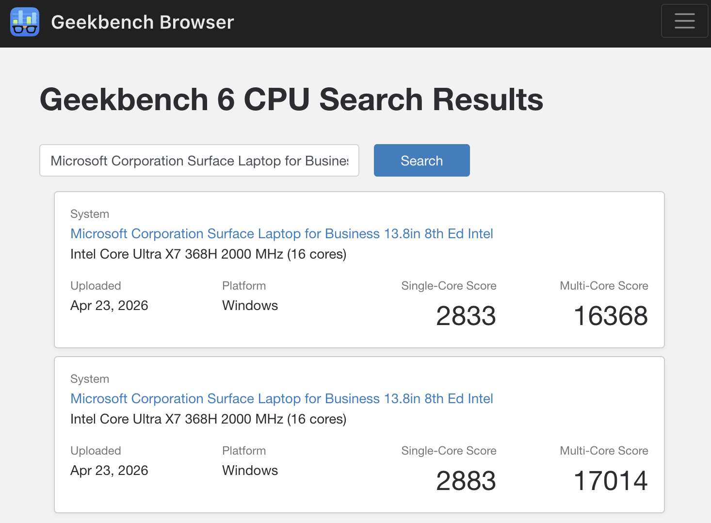 Tuttavia, diversi elenchi di Geekbench riportano che Microsoft offrirà versioni Intel del Surface Laptop 8 con fino al Core Ultra X7 368H. Un processore a 16 core, il Core Ultra X7 368H sostituisce l'iGPU a 4 core di Intel iGPU a 4 core per un equivalente a 12 core, commercializzato con il nome di Arc B390.