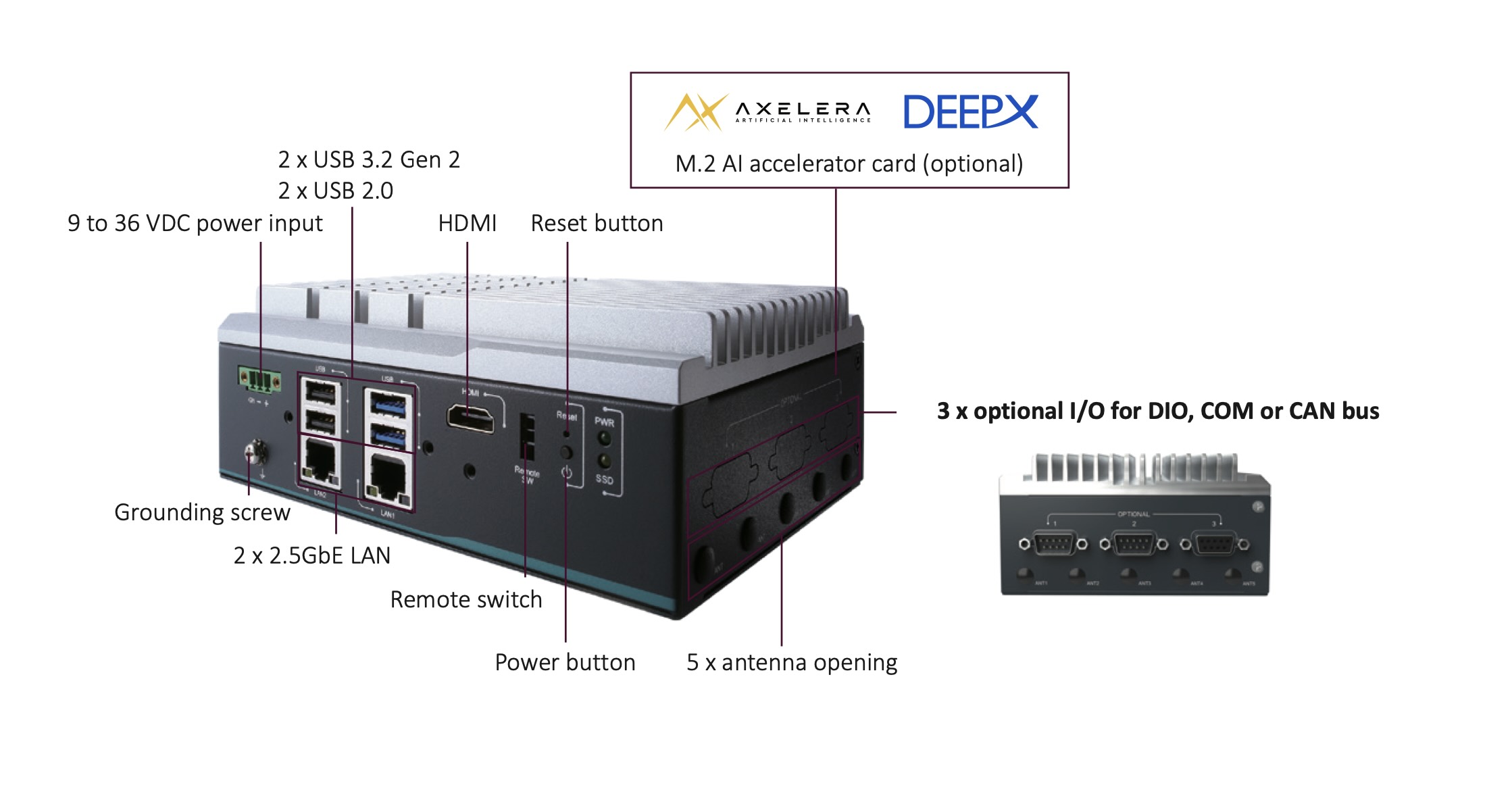 Il mini PC industriale è dotato di 8 o 16 GB di SDRAM LPDDR5, e i requisiti di archiviazione sono gestiti da uno slot M.2 2280 da 2,5 pollici e da uno slot mSATA. È presente anche uno slot M.2 2230 per ospitare le schede di rete wireless. Il raffreddato passivamente raffreddato passivamente è costruito in alluminio e acciaio, conferendo al mini PC un aspetto molto industriale, che si adatta agli ambienti a cui è destinato. Inoltre, è presente anche uno slot per nano SIM. L'I/O offerto è il seguente:
