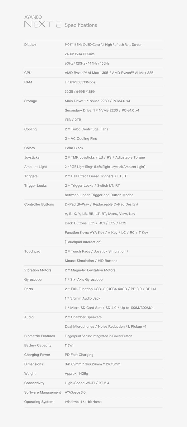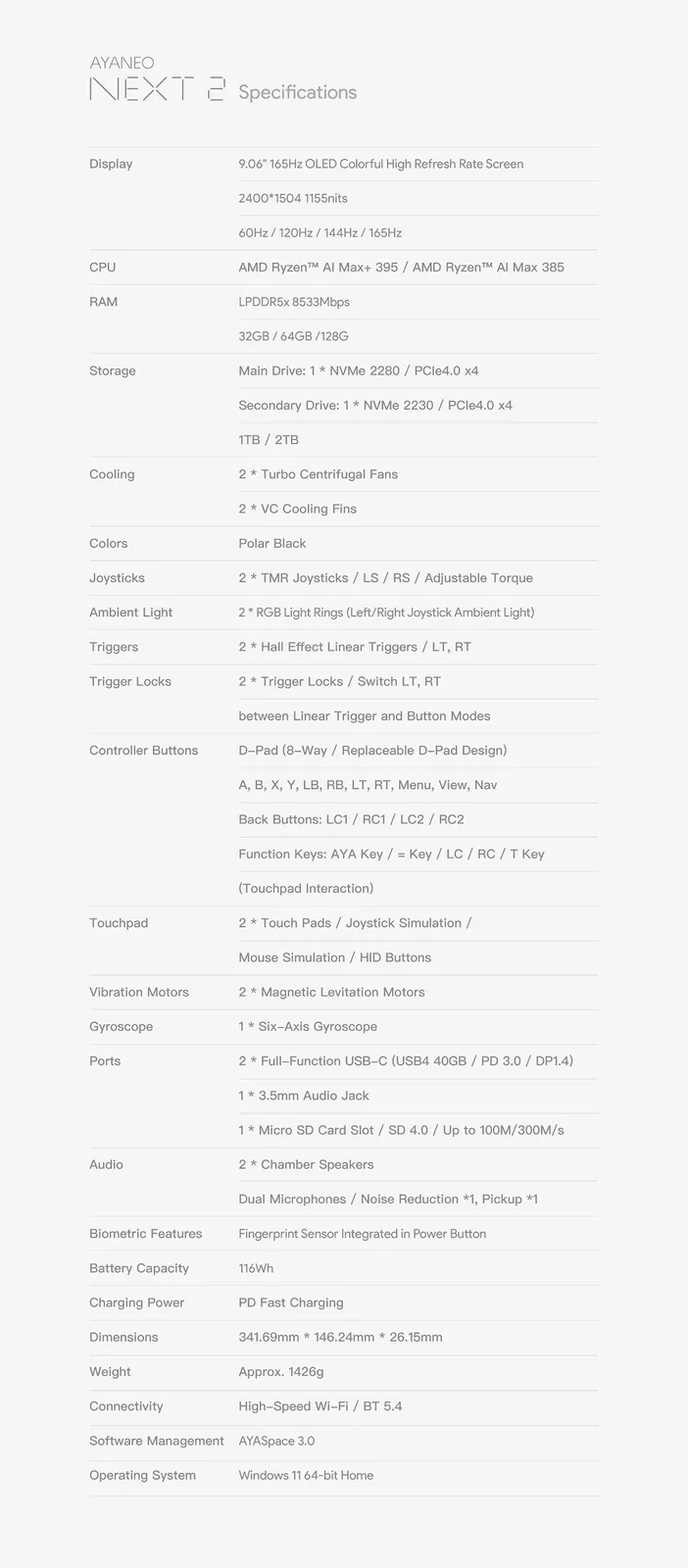 In particolare, Ayaneo offre il Next 2 sia con il modello Ryzen AI Max 385 o Ryzen AI Max+ 395proprio come il OneXPlayer Apex e GPD Win 5(al momento 2.399,99 dollari su Amazon). Il Next 2 si discosta dai suoi colleghi con un display OLED da 9,06 pollici e una batteria esterna da 116 Wh. Nel complesso, il Next 2 misura 341,69 x 146,24 x 26,15 mm e pesa circa 1,43 kg. Per i dettagli tecnici completi, consulti la scheda tecnica qui sotto.