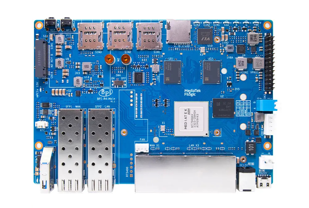 In sintesi, la BPI-R4 dispone di tre connessioni LAN Gigabit, una connessione WAN Gigabit, oltre a gabbie da 10 Gigabit per LAN e WAN. Inoltre, Banana Pi ha lasciato spazio per una scheda di interfaccia di rete (NIC) WiFi 7 che si collega al BPI-R4 attraverso gli slot mPCIe montati sul retro. Inoltre, la scheda da 148 x 100,5 mm ha anche spazio per due slot M.2, uno slot per schede MicroSD e tre slot per schede Nano SIM, tutti sostenuti da un chipset MediaTek Filogic 880 (MT7988A).