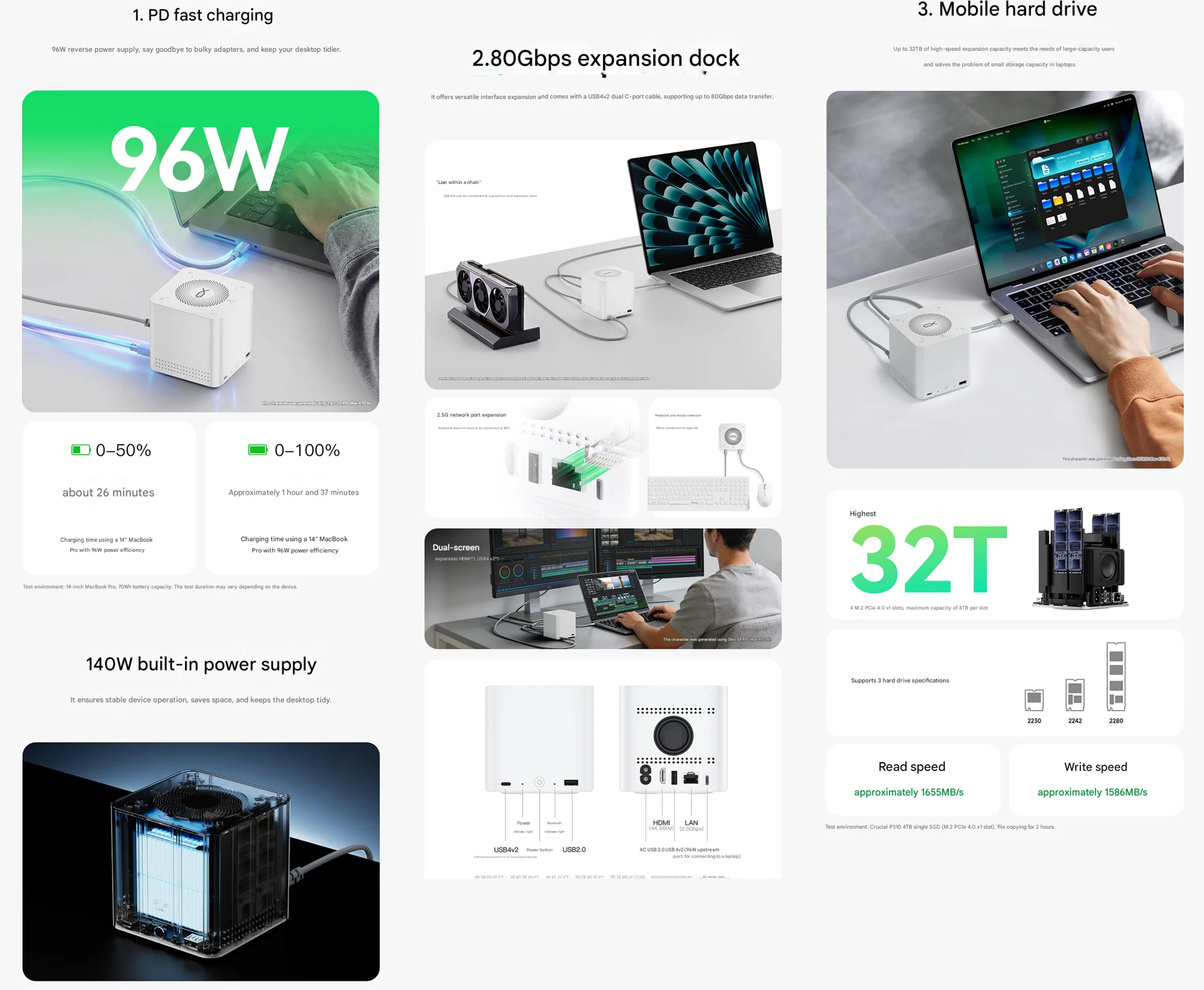 Un altro punto chiave del dock sono i quattro slot M.2, che possono contenere un totale di 32TB di spazio di archiviazione. Beelink fa notare che si tratta di slot PCIe 4.0 x1 e sostiene che il dock può offrire una velocità di lettura di 1.655MB/s con una velocità di scrittura di 1.586MB/s.