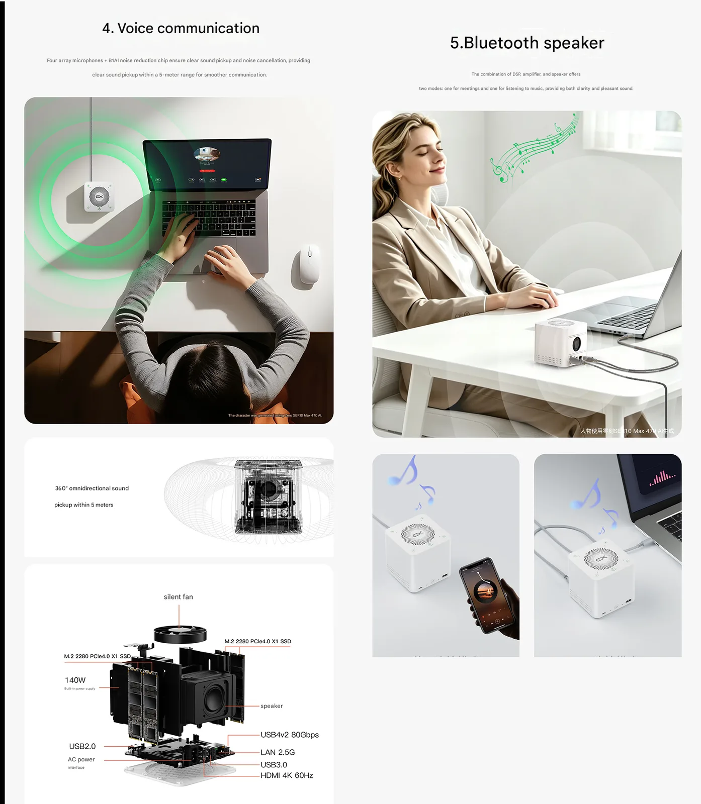 Il dock dispone anche di connettività Bluetooth, che è per l'altoparlante integrato. Beelink afferma che c'è un DSP e un amplificatore integrati un amplificatore per garantire una buona qualità audio durante le riunioni e la riproduzione di musica. L'audio può essere riprodotto anche in modalità cablata, ma in questo caso, attraverso il PC collegato. Dispone anche di una ventola per mantenere freschi gli interni.