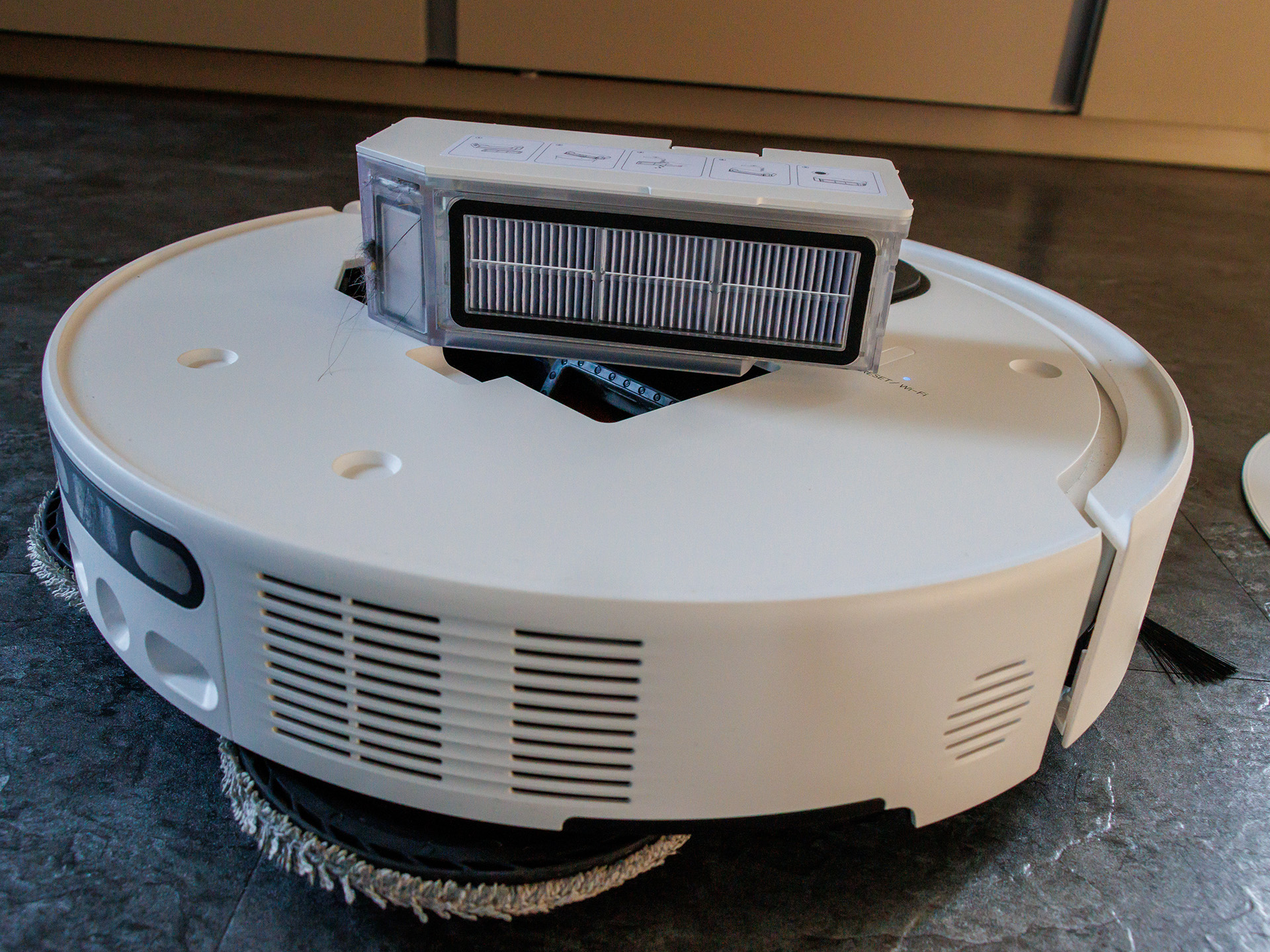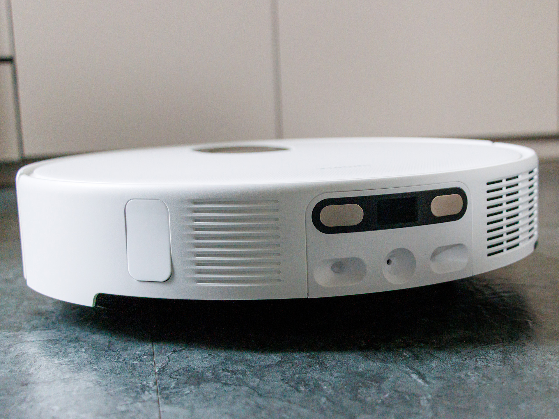 Nella parte anteriore, c'è una configurazione AI a tripla telecamera composta da telecamere RGB e a infrarossi, oltre a un proiettore di punti 3D a infrarossi, progettato per rilevare più di 200 oggetti in tempo reale. Di solito funziona in modo affidabile nell'uso quotidiano, ma i piccoli mattoncini Lego vengono spesso trascurati e persino una moneta da 1 penny è finita nel sacchetto della polvere. Durante i test, il robot aspirapolvere ha avuto problemi anche nel rilevare un cavo sotto il divano.