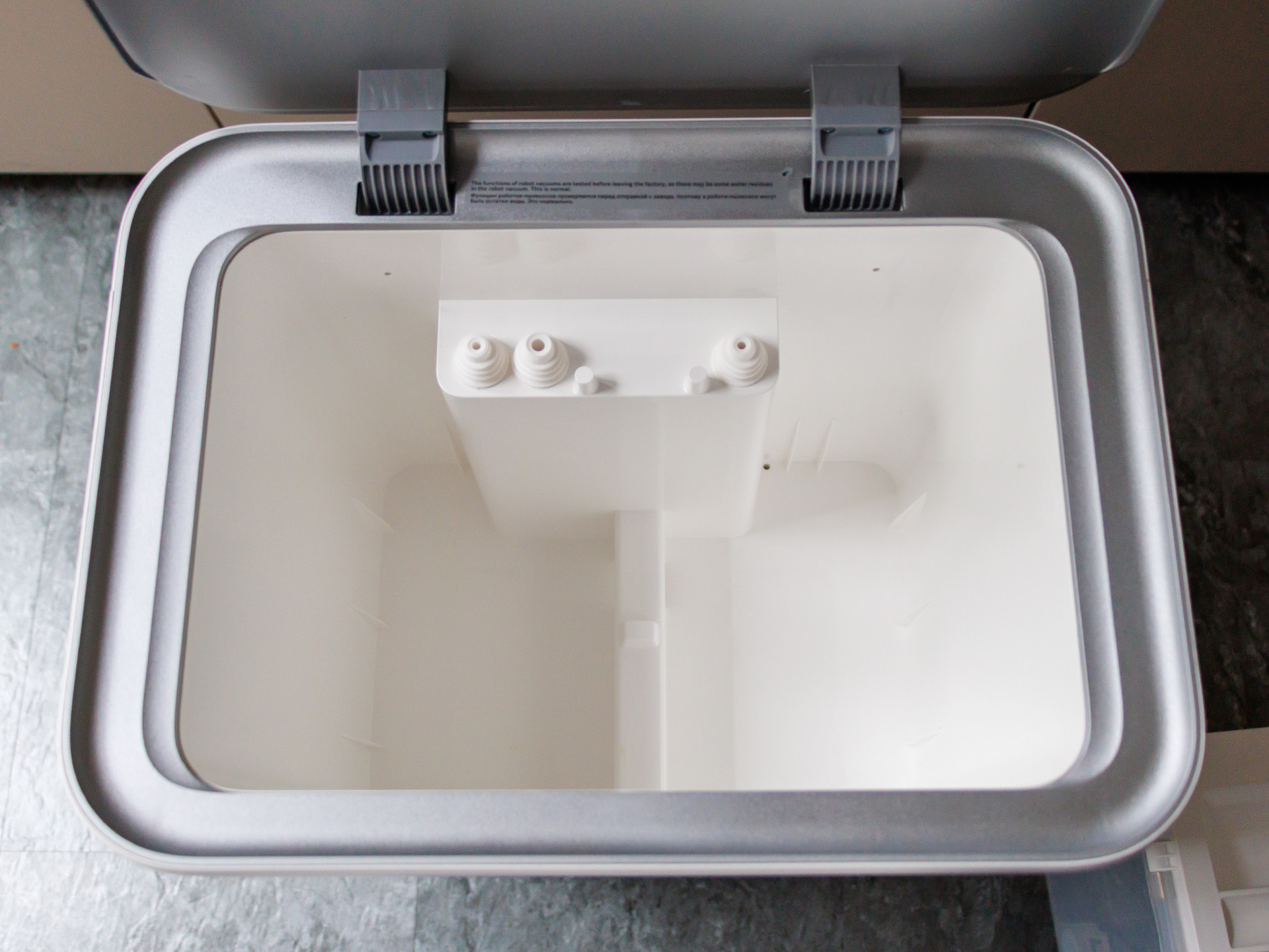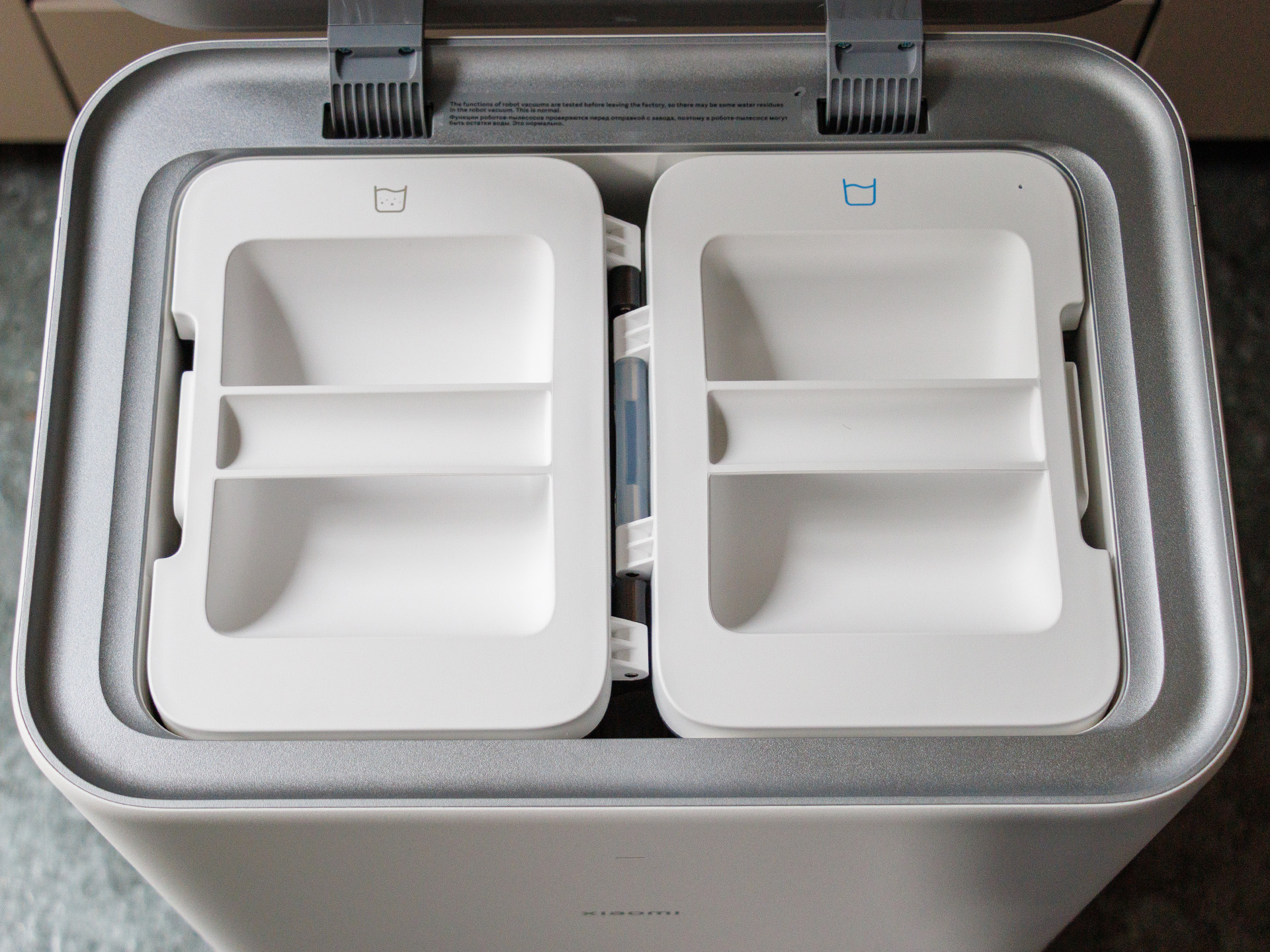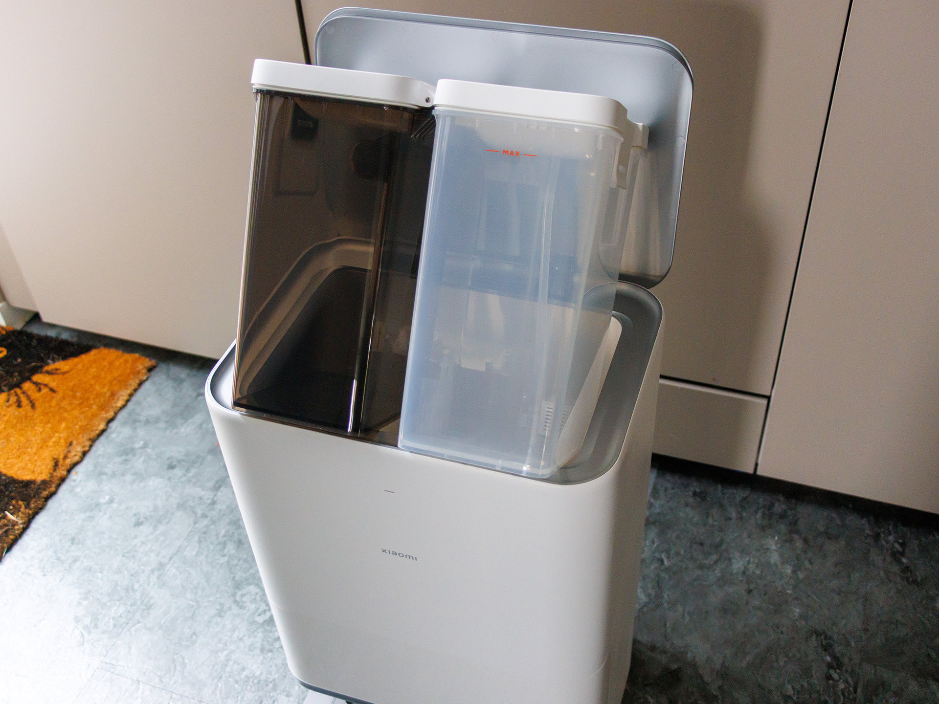 La pattumiera è piuttosto piccola, quindi il robot aspirapolvere/mocio deve tornare alla sua stazione di ricarica più frequentemente quando si puliscono grandi aree. I mop possono anche essere puliti automaticamente con acqua calda a 80°C. Purtroppo, Xiaomi Robot Vacuum 5 Pro non dispone di un serbatoio per la soluzione detergente; invece, lava i panni solo con l'acqua. Abbiamo constatato che la quantità d'acqua utilizzata fuori dalla scatola è piuttosto bassa, motivo per cui abbiamo eseguito la maggior parte del test a livello 3. Un serbatoio d'acqua pieno nella stazione di ricarica era sufficiente per poco più di 240 metri quadrati.