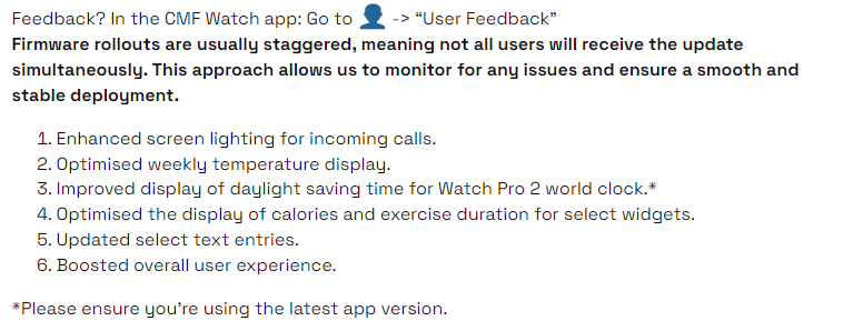 Nel forum Nothing, diversi utenti hanno segnalato la presenza di modifiche alle watchface AOD (always-on-display), che stanno ricevendo recensioni contrastanti. Non è chiaro quando il rollout graduale della versione firmware 1.0.0.51 per il CMF by Nothing Watch Pro 2 sarà completato. L'azienda suggerisce agli utenti di assicurarsi di avere l'ultima versione dell'applicazione CMF Watch prima di procedere con l'aggiornamento. Inoltre, chiede di registrare qualsiasi feedback tramite l'app, andando sul profilo e selezionando "Feedback dell'utente".