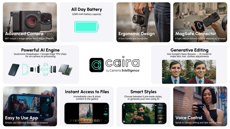 Caira viene pubblicizzato come un aggiornamento completo della fotocamera per l'iPhone Apple. La fotocamera si attacca magneticamente allo smartphone tramite MagSafe e dispone di un sensore Quattro Terzi che, secondo il produttore, è più grande del 400% rispetto al sensore della fotocamera principale dell'iPhone 17 Pro Apple.