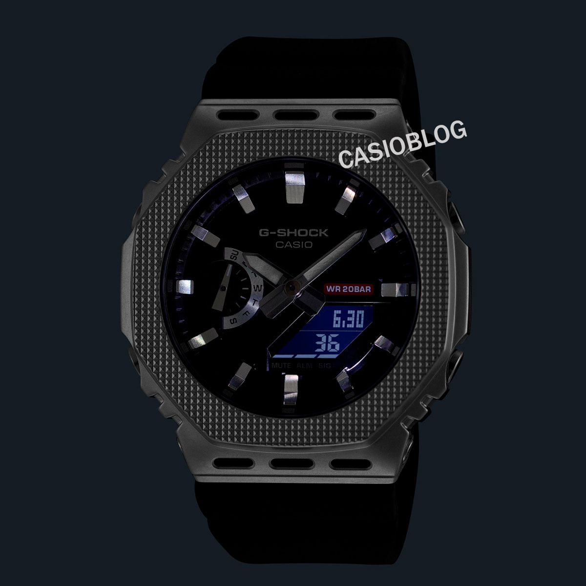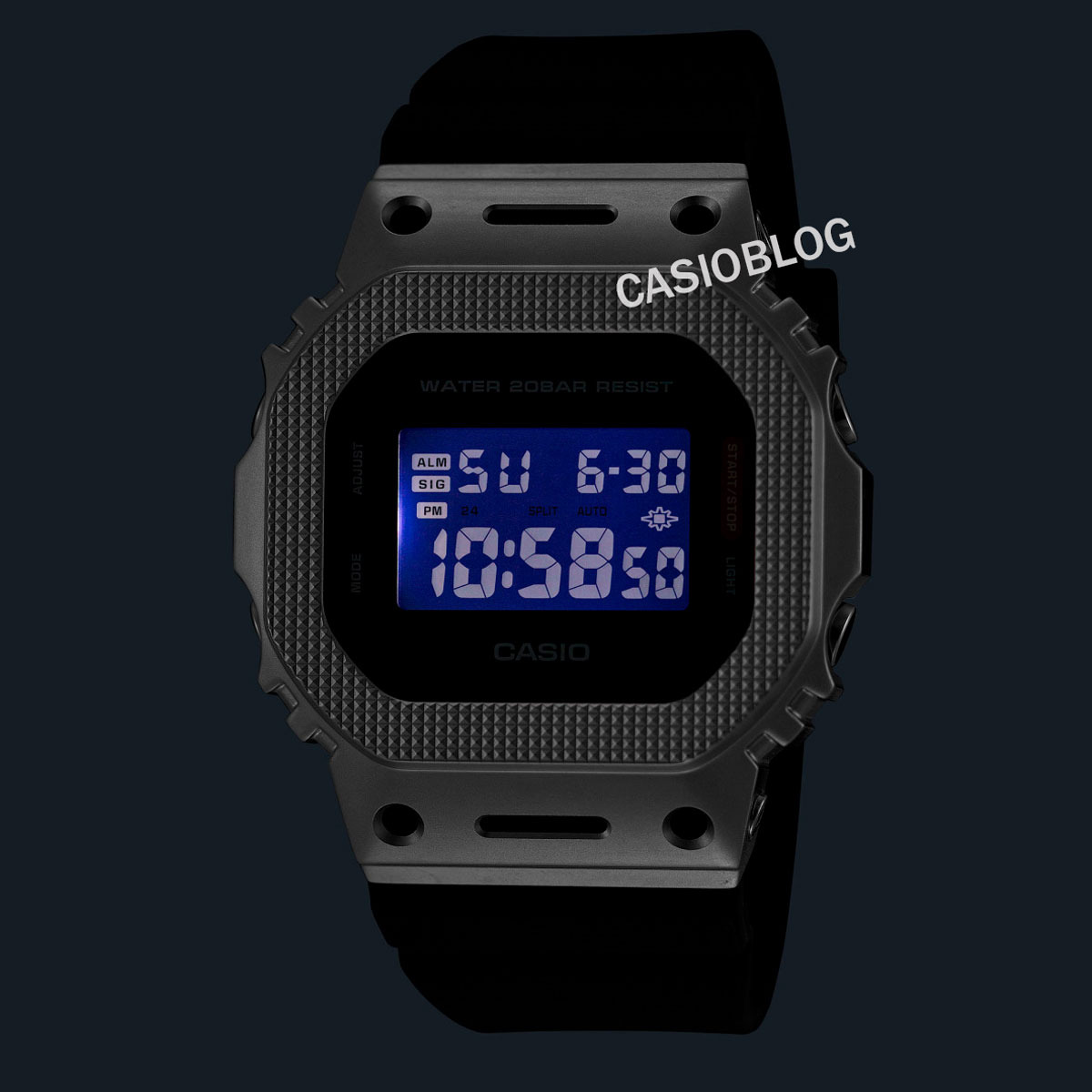 Entrambi i modelli, GM-5600M-1 e GM-2100M-1A, sono dotati di LCD negativi (invertiti) con un elevato contrasto - e l'etichetta rossa "WR 20BAR" dà un tocco di colore al quadrante completamente nero. Inoltre, c'è una copertura specifica che evidenzia come l'intera superficie, non solo la lunetta, sia trattata al laser per un aspetto opaco e antiriflesso, che riduce ulteriormente la possibilità di usura visibile o di impronte digitali - un bonus per gli utenti che indossano il prodotto quotidianamente.