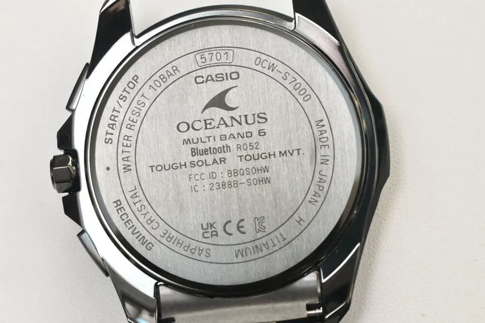 Le foto del profilo laterale mostrano una cassa relativamente sottile, considerando l'elenco delle caratteristiche, e la forma delle anse sembra che possa essere indossata comodamente. I pulsanti e la corona hanno una struttura pulita e angolare, e la corona presenta un simbolo Oceanus inciso. Il fondello mostra Bluetooth, sincronizzazione radio Multiband 6, Tough Solar, vetro zaffiro e resistenza all'acqua a 10 bar.