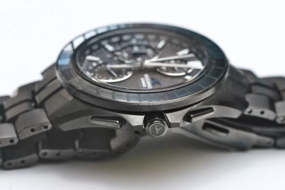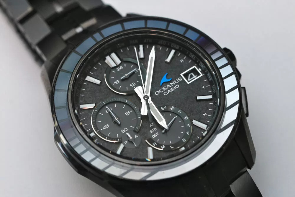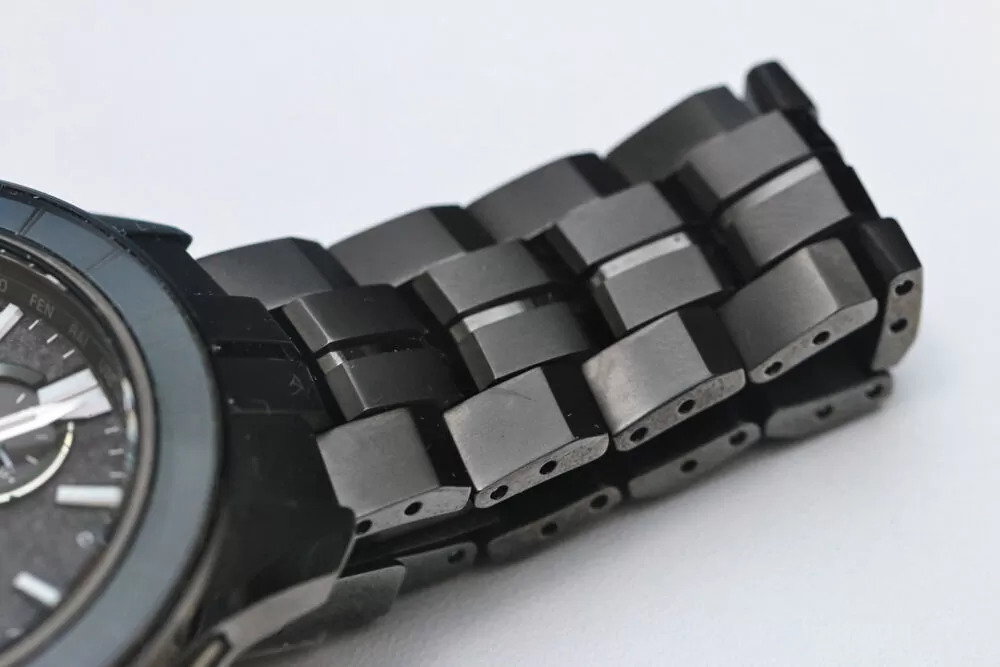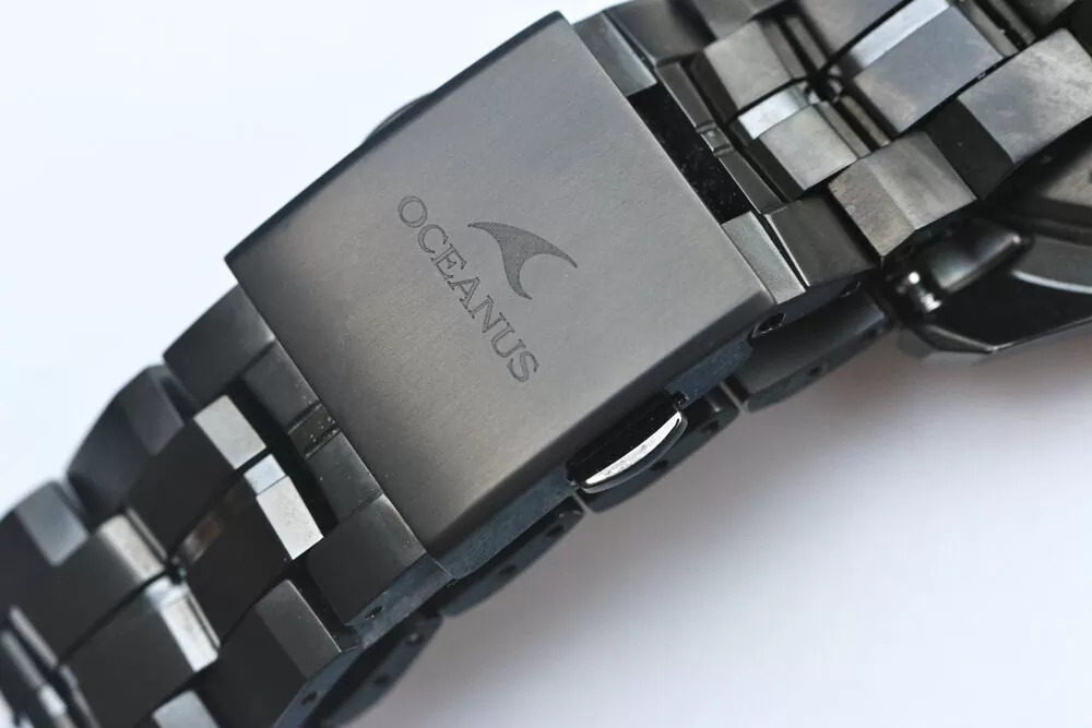 La prima cosa che attira l'attenzione è la cassa e il bracciale. L'orologio sembra utilizzare una struttura interamente in titanio con una finitura DLC nera, e i primi piani mostrano bordi più netti e una lavorazione più complessa del solito. Le maglie del bracciale presentano sfaccettature notevolmente angolari e la spazzolatura sembra profonda piuttosto che leggermente verniciata. La foto della chiusura mostra anche un logo Oceanus ben inciso, con una texture opaca che completa la lucidatura riflettente intorno ad esso.