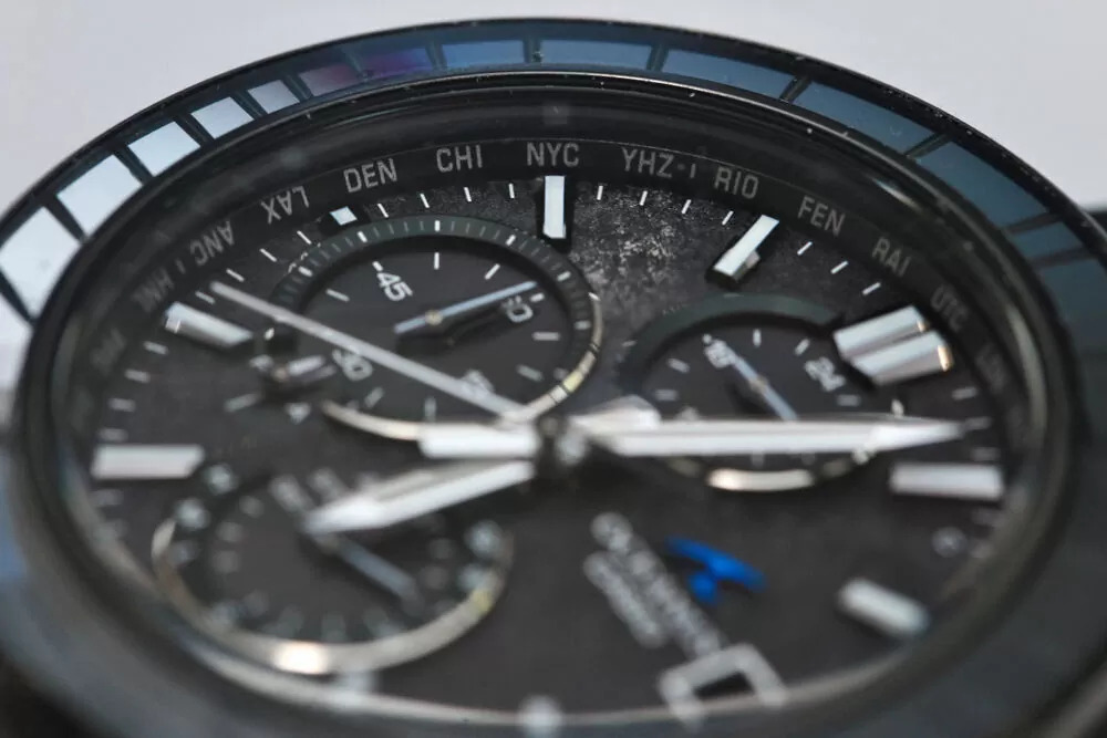 Ma la caratteristica principale di queste angolazioni è la lunetta in zaffiro, che sarà un grande punto di forza per questo orologio. Le sfaccettature intorno alla lunetta raccolgono la luce e passano dai toni del blu scuro a quelli dell'argento, a seconda dell'angolazione. È il tipo di dettaglio che non si traduce bene nei rendering in studio, ma che appare impressionante nella vita reale. Si possono anche vedere le abbreviazioni delle città del mondo sotto il bordo interno della lunetta - NYC, RIO, DEN, HNL e altre.