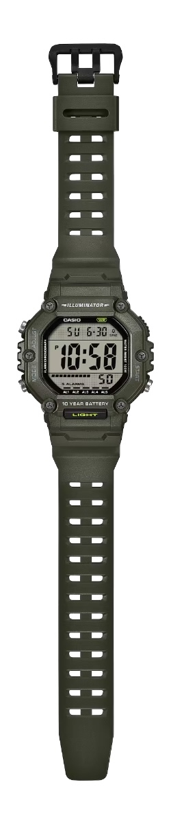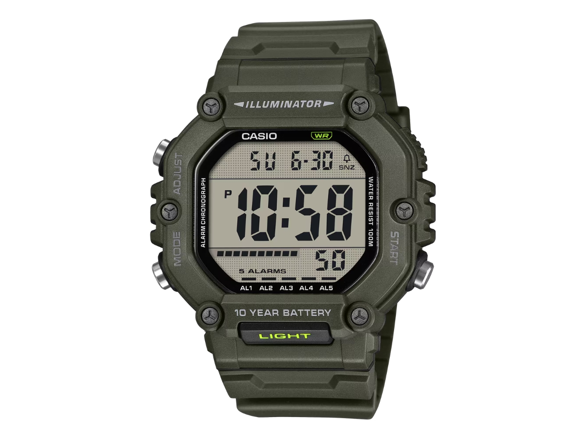 L'AE-1600 di Casio è un orologio a doppio orario, con strumenti come il cronometro, il timer per il conto alla rovescia e cinque allarmi giornalieri. Il display digitale può essere illuminato con una retroilluminazione LED ambra, premendo un pulsante. Altre caratteristiche degne di nota sono la resistenza all'acqua di 100 metri e la durata di 10 anni della batteria CR2032.