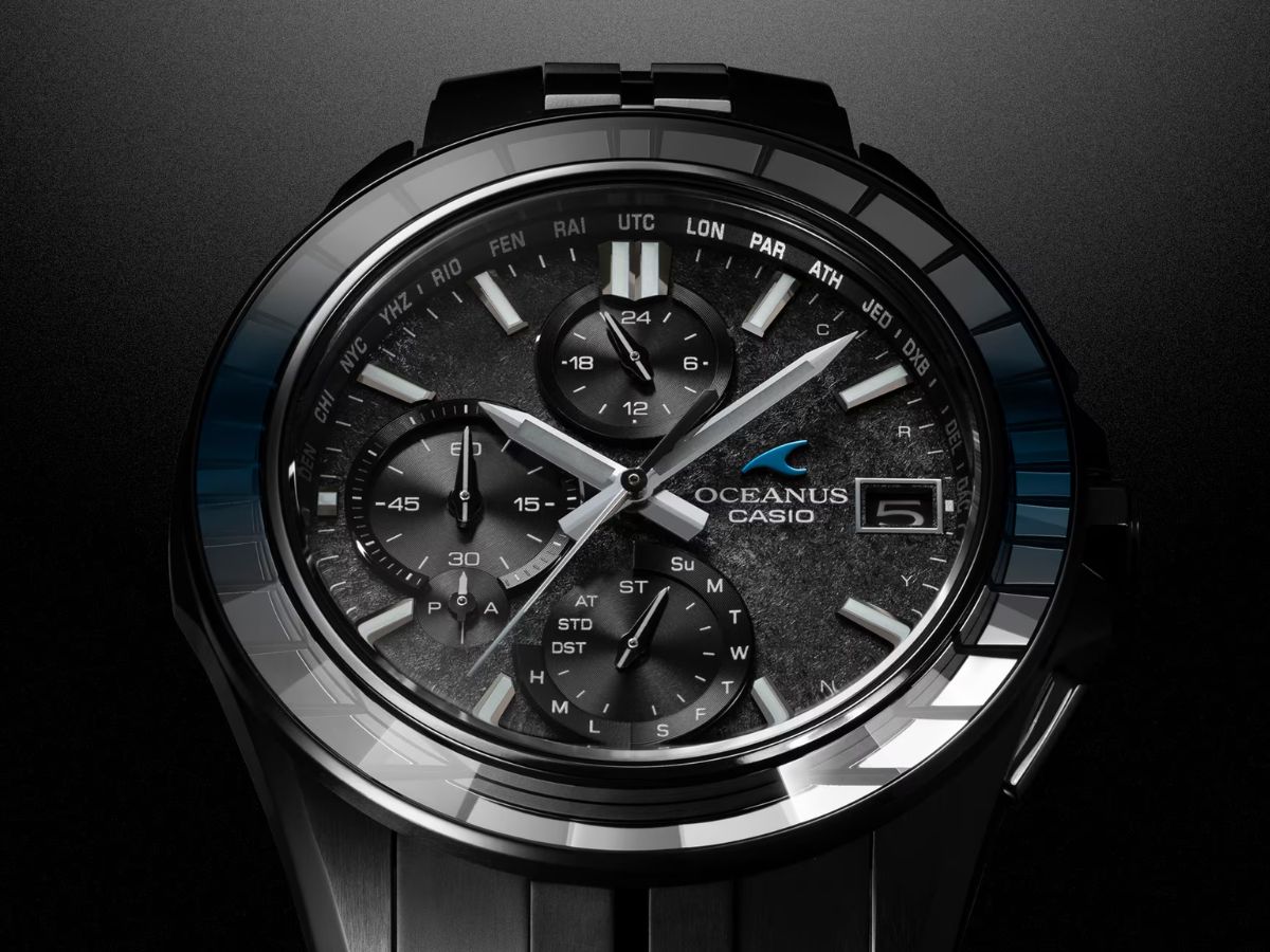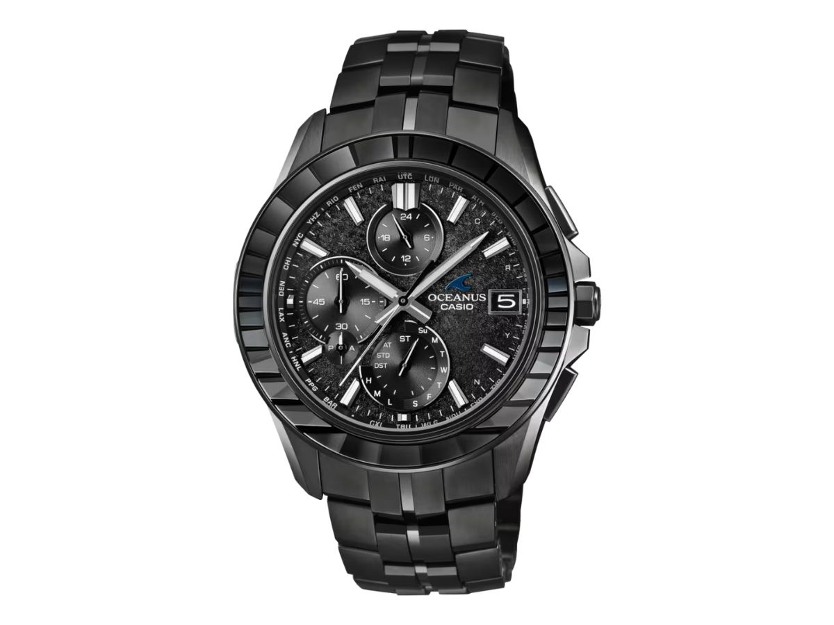 Il Casio Oceanus Manta OCWS7000CN1A è un orologio nero, con un quadrante dalla texture opaca e una lunetta in vetro zaffiro tagliata a mano che brilla di blu quando cattura la luce. La cassa e il cinturino con chiusura tripla sono entrambi in titanio e il modello è commercializzato come impermeabile fino a 100 metri.