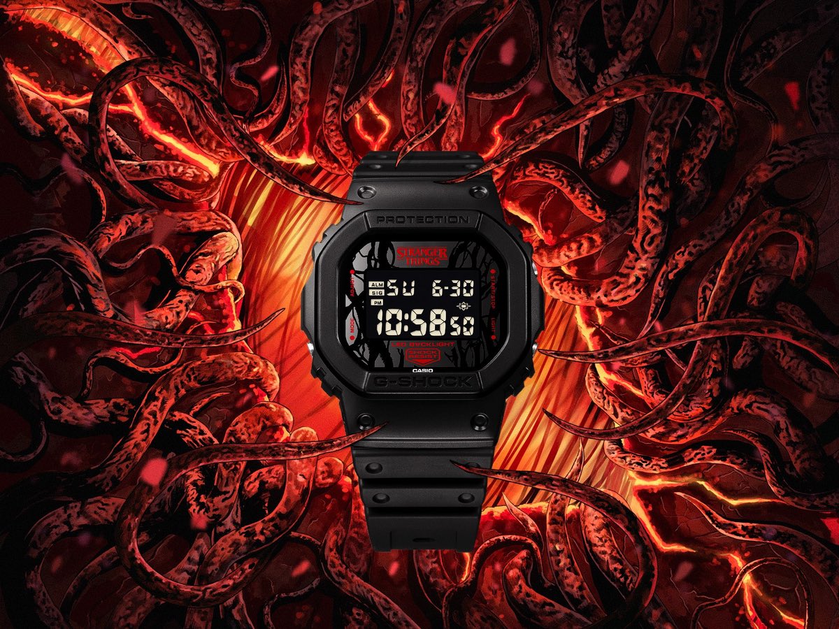 Mentre il primo orologio collaborativo di Stranger Things si basava sul modello retrò A120WE e presentava un tema multicolore, l'ultimo modello riprende il classico DW-5600 dalla forma quadrata e aggiunge molti dettagli inquietanti che i fan di Stranger Things apprezzeranno. Il nuovo orologio abbraccia il concetto centrale dello show del "Sottosopra", l'oscura dimensione alternativa che esiste in parallelo al mondo reale.