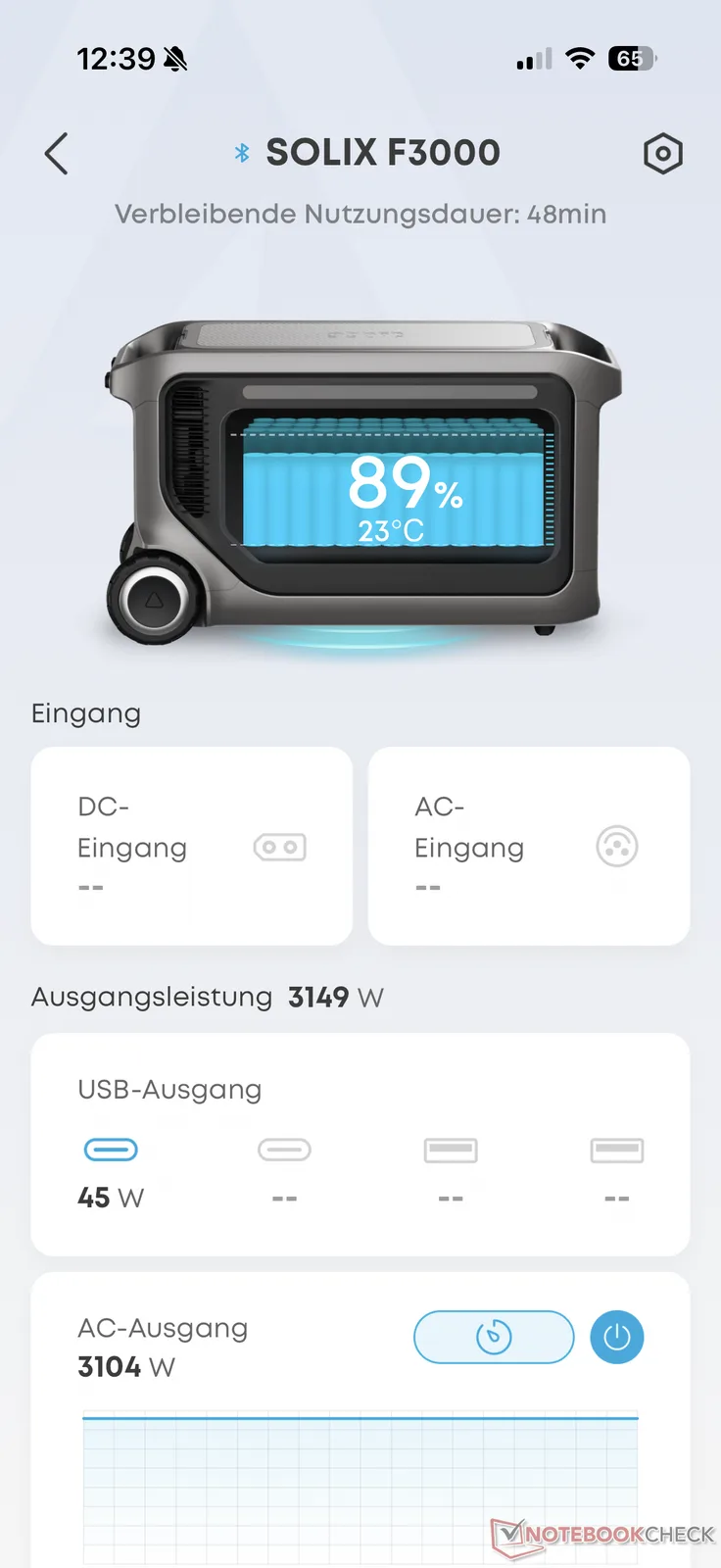 Un aspetto positivo del test di Anker Solix F3000 è stato il suo funzionamento silenzioso. Anche con una buona uscita da 3.000 W CA, la stazione elettrica funziona in modo molto silenzioso. Solo occasionalmente faceva un po' di rumore, ma rimaneva piacevolmente in sottofondo a circa 35 dB (misurati da una distanza di 1 m). Inoltre, la funzione UPS per l'alimentazione ininterrotta è intervenuta rapidamente quando necessario.