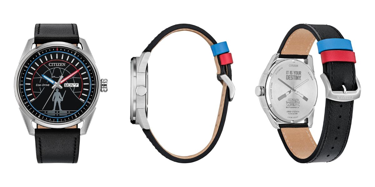 L'orologio Citizen Star Wars Duel ha un quadrante nero, con i contorni color argento di Luke Skywalker e Darth Vader, che hanno duellato a Cloud City nel film L'Impero colpisce ancora. Ci sono accenti rossi e blu dappertutto, comprese le ventole piene di lume e i passanti del cinturino; questi sono i colori delle spade laser utilizzate nel combattimento. Il quadrante è circondato da una cassa in acciaio inossidabile spazzolato, che misura 42 mm (~1,65 pollici), con il fondello in acciaio inciso con il testo "È il tuo destino" e due spade laser.