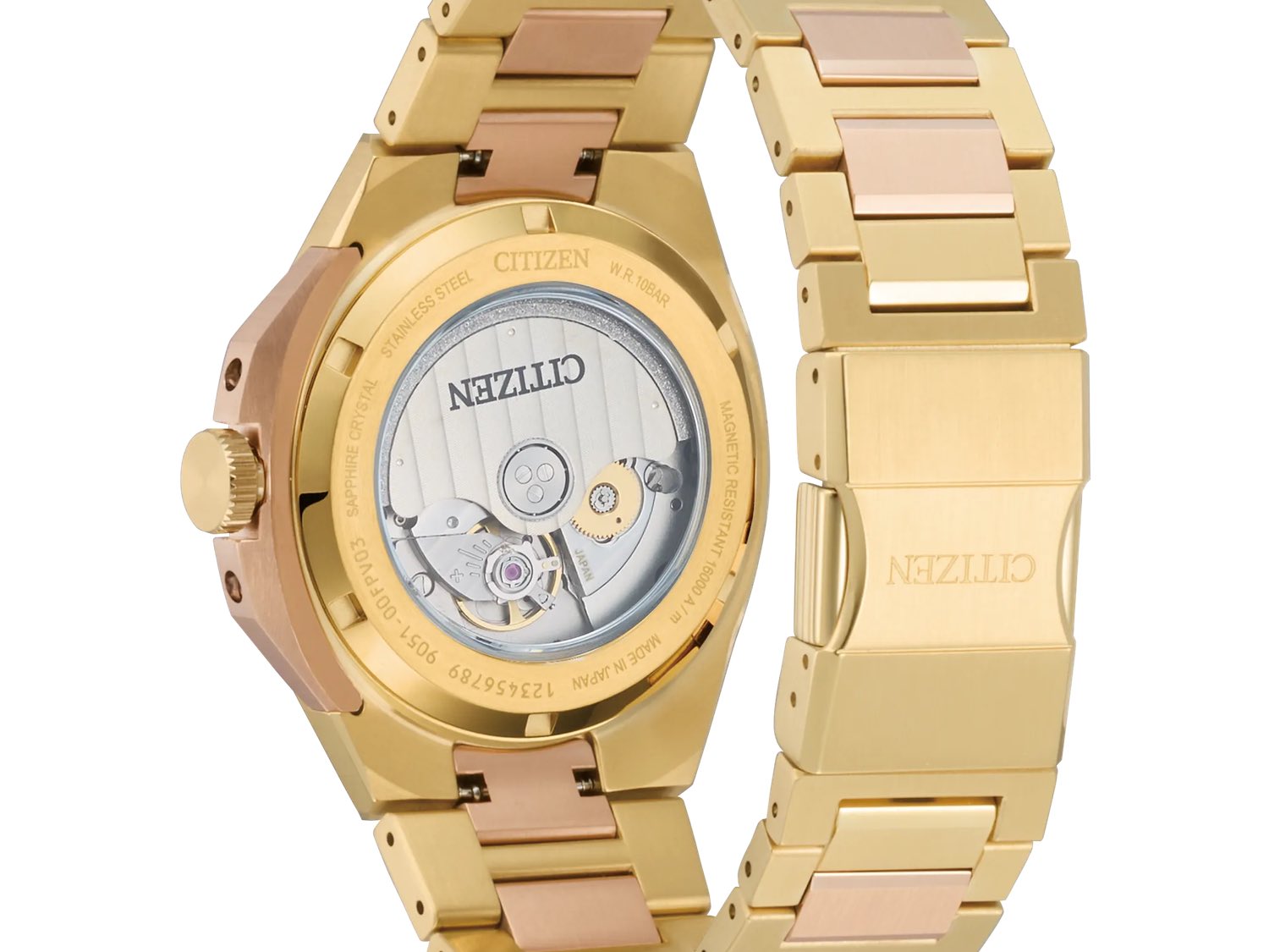 Nel frattempo, il quadrante incorpora un motivo geometrico strutturato ispirato al tradizionale ichimatsu giapponese (a scacchiera) e presenta una base in tonalità oro, indici e lancette in oro rosa e una finestrella della data a ore 3. Un vetro zaffiro antiriflesso protegge il quadrante, mentre il fondello permette di vedere il movimento interno di Citizen al lavoro. L'orologio misura circa 10,4 mm di spessore e pesa 147 grammi con il bracciale.