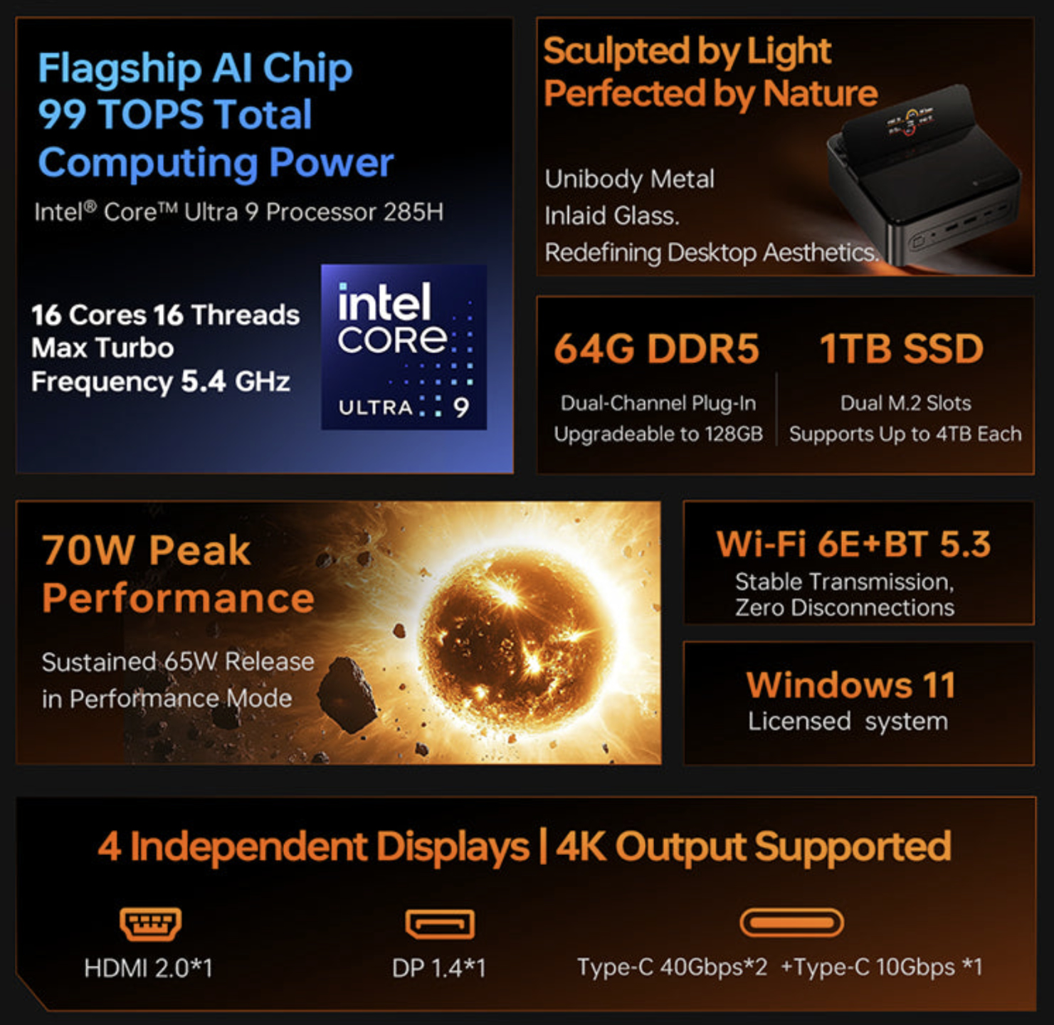 Per il momento, Machenike ha commentato la disponibilità globale di entrambe le varianti. Invece, Minixpc ha deciso di tenere in stock il Machenike GTS e il suo display di stato ribaltabile per coloro che vivono fuori dalla Cina. Purtroppo, il rivenditore offre Machenike GTS solo nella sua configurazione più costosa, per competere con altri mini-PC Intel Arrow Lake-H come il modello GMKtec EVO-T1 (attualmente 1.469,99 dollari su Amazon).