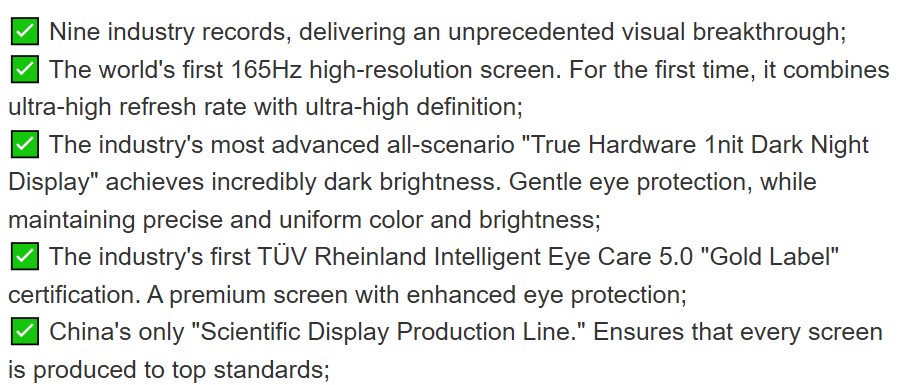 A causa dei limiti dei materiali luminescenti e della tecnologia dei circuiti, l'industria non è attualmente in grado di raggiungere le specifiche 165Hz e 2K contemporaneamente. Lo schermo X3 da 165 Hz + 1.5K è la soluzione ottimale e il vertice della tecnologia di visualizzazione dei telefoni cellulari. Prima di questo, la risoluzione più alta per gli schermi a 165Hz ad altissima frequenza di aggiornamento sui telefoni cellulari era solo 1080p. Questo schermo X3 è il primo schermo 165Hz + 1.5K del settore. Dopo anni di convalida da parte del mercato, gli schermi da 1.5K rappresentano oggi un eccellente equilibrio tra qualità di visualizzazione di alto livello ed efficienza energetica su molti telefoni di punta dei principali marchi, quindi non c'è bisogno di preoccuparsi dell'esperienza effettiva. In secondo luogo, la frequenza di aggiornamento ultraelevata di 165Hz offre un'esperienza fluida senza precedenti e rappresenta il futuro degli schermi dei telefoni cellulari.