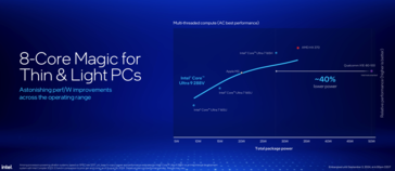 Nel confronto con Meteor Lake U (14 thread), Lunar Lake con otto thread è più veloce del 22% secondo Intel, con un consumo di 9 W. Meteor Lake H con 22 thread a un consumo di 17 W viene battuto del 10%. Solo quando il TDP è impostato a 23 W, il predecessore con più core è più veloce del 6 percento. Tuttavia, il consumo energetico di Lunar Lake include la memoria on chip, che non è inclusa in Meteor Lake.