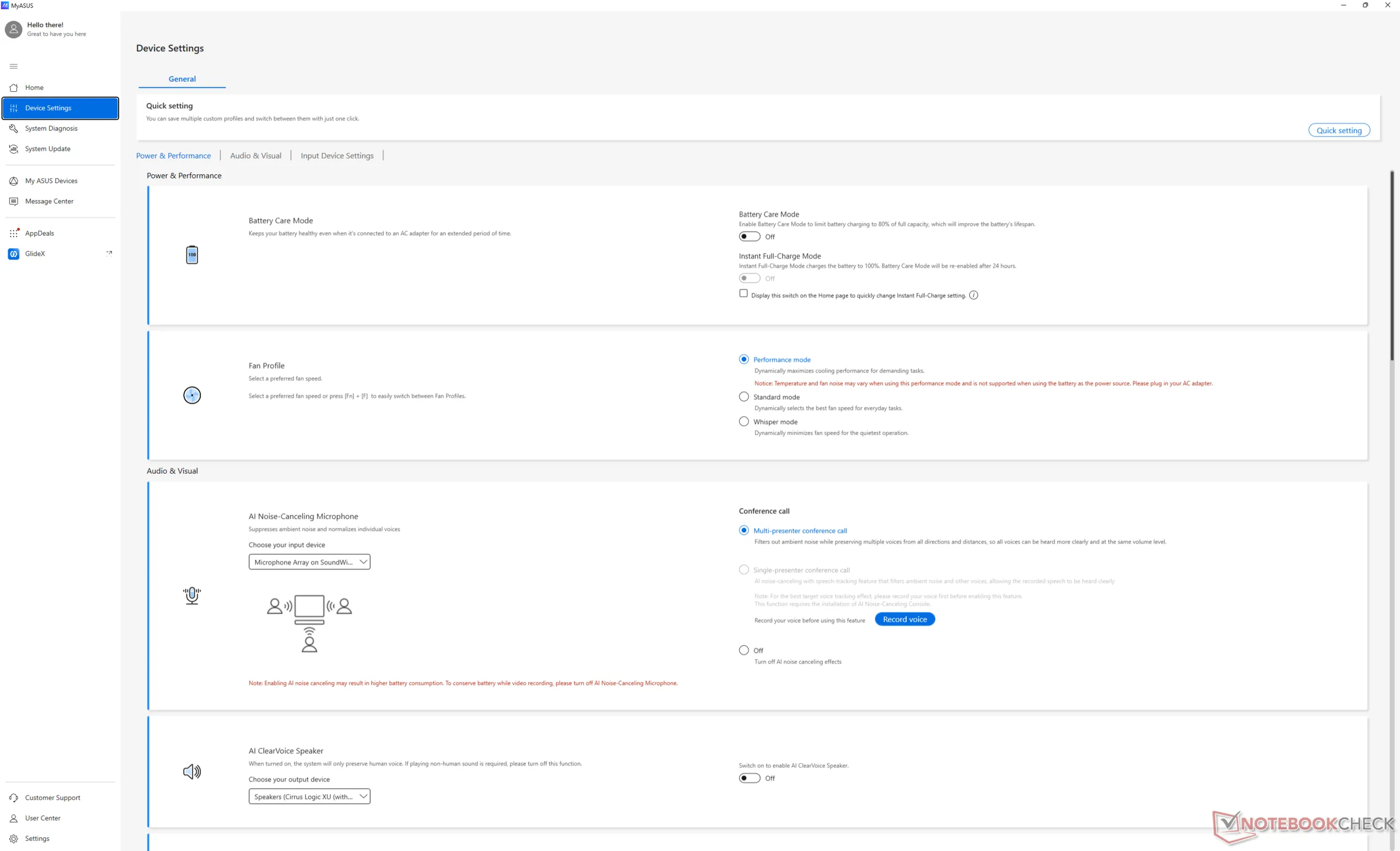 Sullo Asus ExpertBook Ultratuttavia, le prestazioni massime del processore sono subordinate a una condizione: l'alimentazione di rete. Come mostrano gli screenshot qui sotto, il funzionamento a batteria può rallentare le prestazioni di circa il 10-15 percento. Il software MyAsus lo conferma persino con un testo rosso che indica "questa modalità di prestazioni non è supportata quando si utilizza la batteria come fonte di alimentazione".