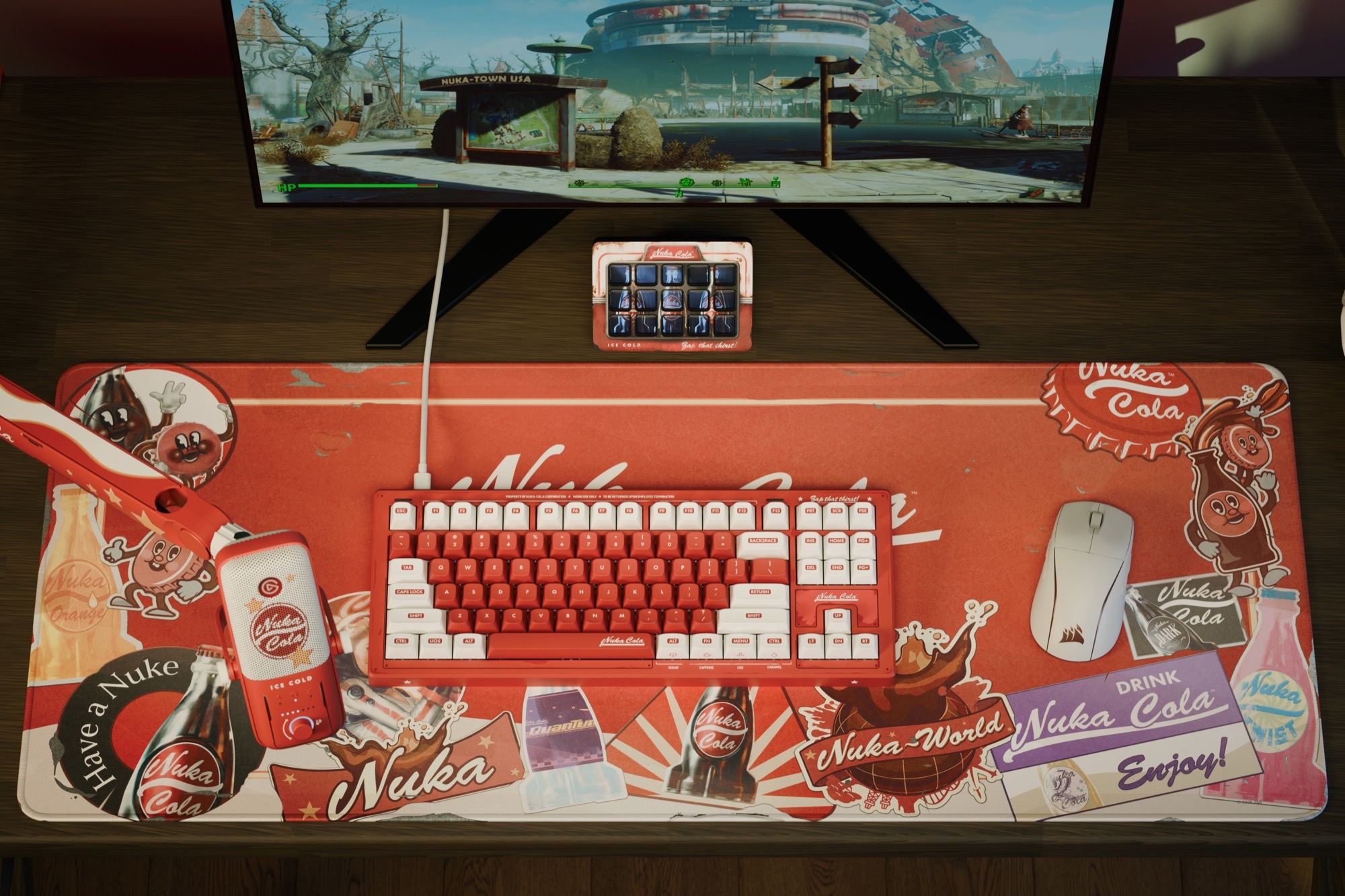 Corsair ha collaborato con Bethesda per lanciare una gamma completa di periferiche di gioco ispirate al design iconico di Nuka Cola, la bevanda più popolare dell'universo di Fallout. La collezione presenta un'estetica retro-futuristica, con una combinazione di colori rosso e bianco, stelle gialle, blocchi di colore audaci e l'elegante logo Nuka Cola.
