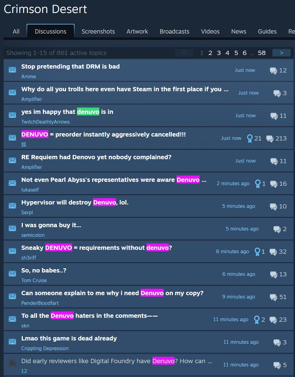 Subito dopo la diffusione della notizia, il forum di Steam del gioco https://steamcommunity.com/app/3321460/discussions/ è stato dominato dalle stesse lamentele. La maggior parte dei giocatori protesta per l'aggiunta tardiva di Denuvo dopo aver deciso di acquistare il titolo. Di conseguenza, gli acquirenti minacciano di annullare i I preordini di Crimson Desert che Valve consente prima del lancio.