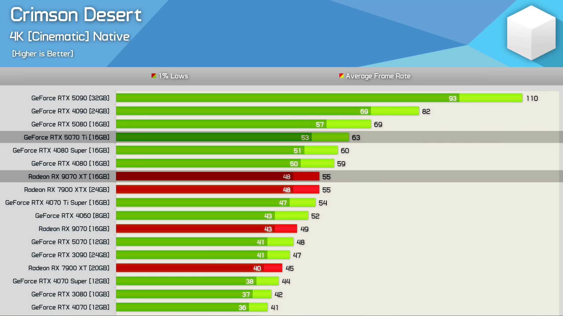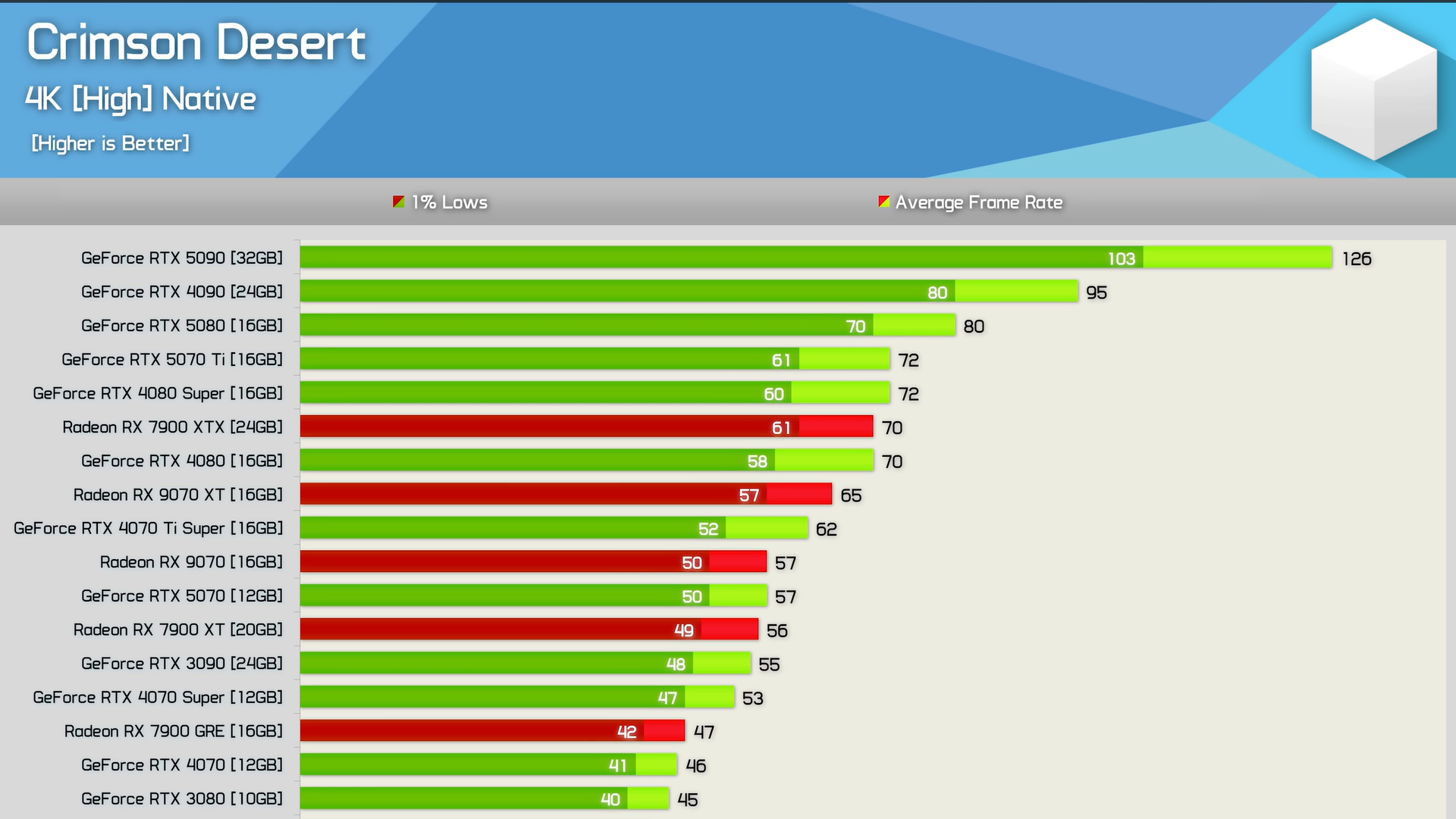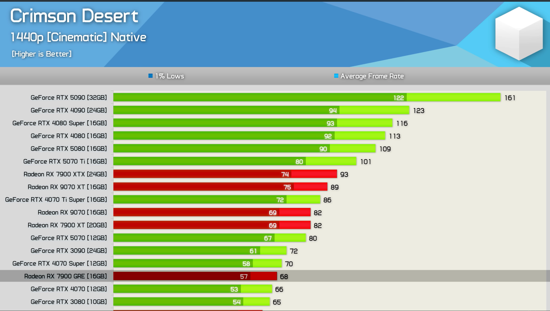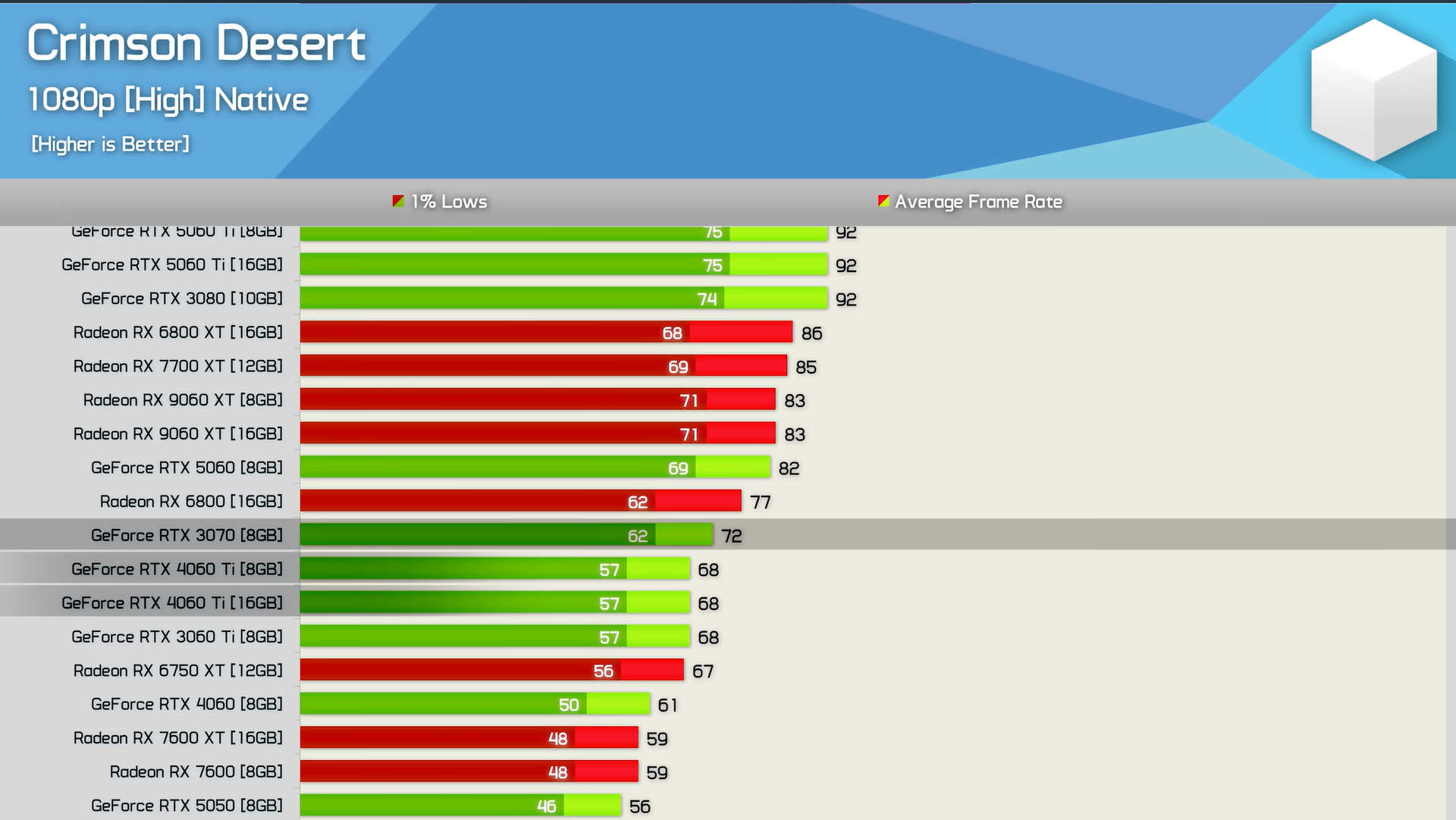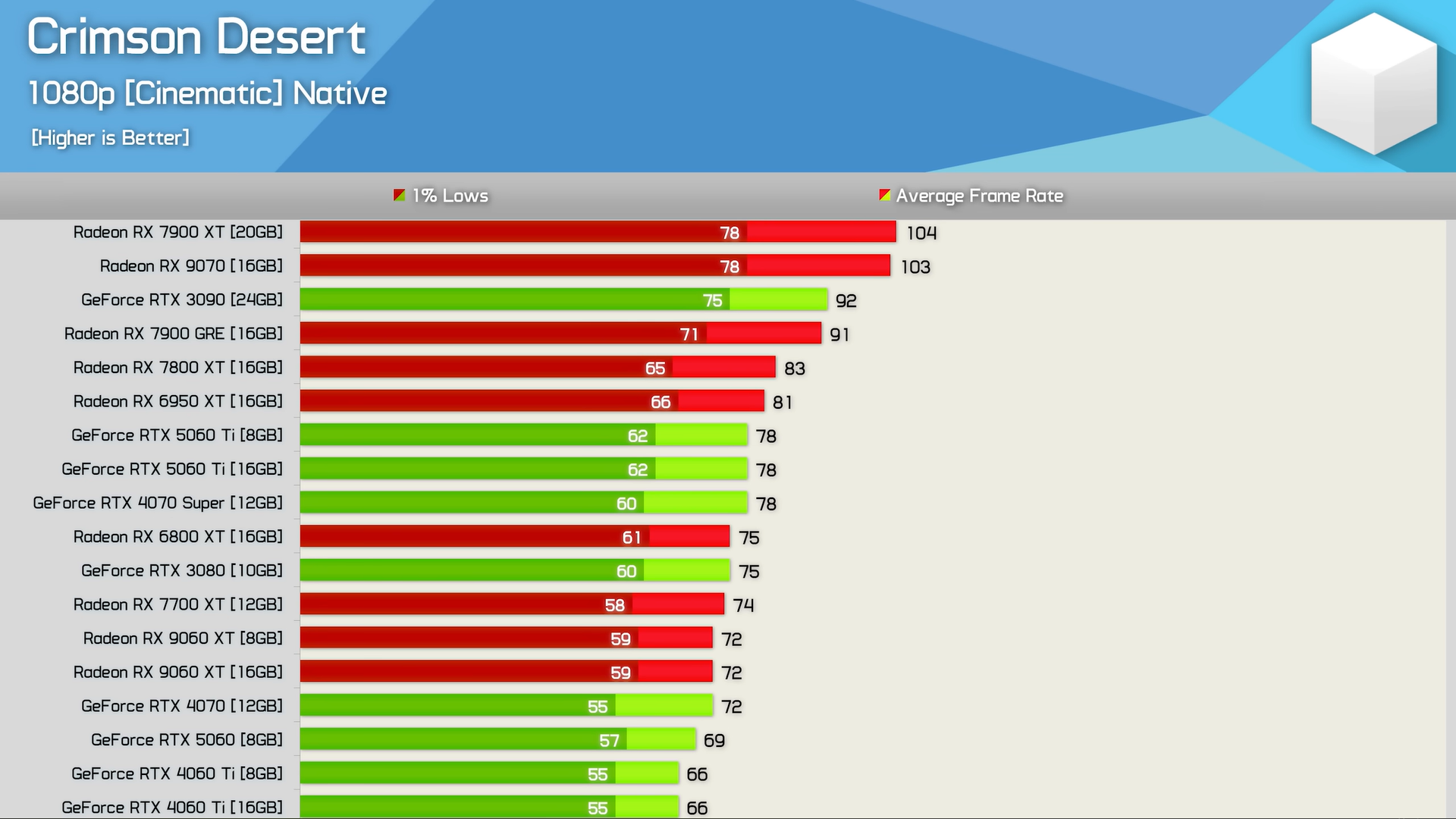 Hardware Unboxed ha misurato le prestazioni di Crimson Desertcon 40 GPU e un Ryzen 7 9800X3D. I risultati parlano da soli: Crimson Desert è in grado di funzionare a 60 FPS stabili anche con GPU modeste come la RX 7600.