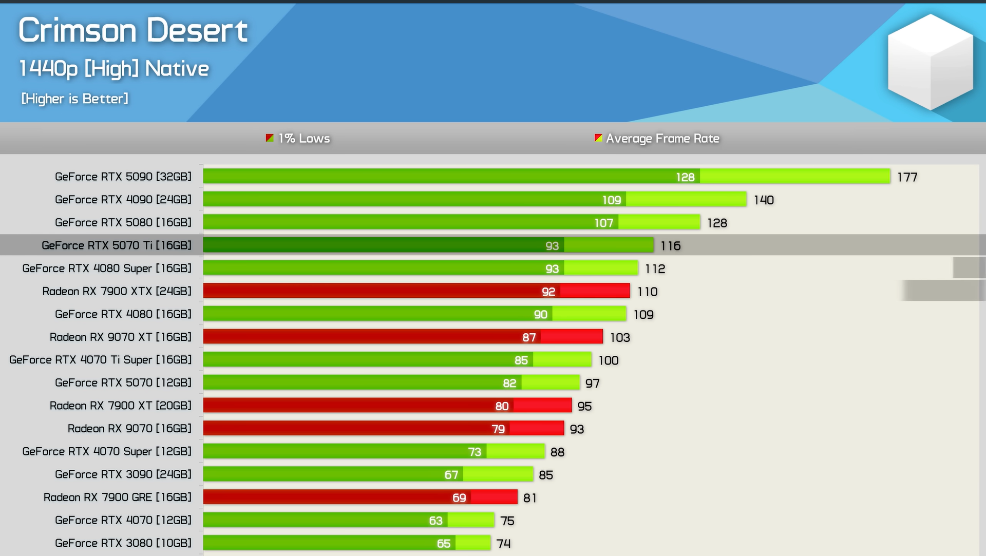 È interessante notare che le schede RTX di GeForce si comportano meglio delle loro controparti Radeon in Crimson Desert. La RTX 5070 Ti, una GPU più lenta della RX 9070 XTappare circa il 13% più veloce della RX 9070 XT in Crimson Desert a diverse risoluzioni. Ci aspettiamo che le prestazioni del gioco migliorino con le patch post-lancio. Quindi, lo sviluppatore Pearl Abyss potrebbe risolvere questa discrepanza con gli aggiornamenti.