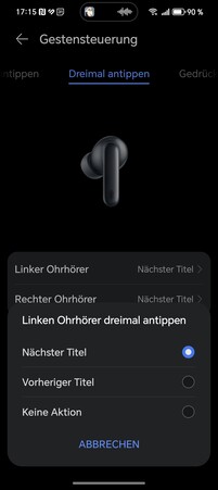 Le cuffie in-ear di Huawei sono controllate tramite una superficie sensibile al tocco. Questa è in grado di distinguere tra doppio e triplo tocco, pressione e mantenimento e scorrimento. Questo funziona molto bene nell'uso quotidiano e può essere personalizzato in base alle proprie esigenze nelle opzioni. Inoltre, è disponibile un controllo semplificato della testa.