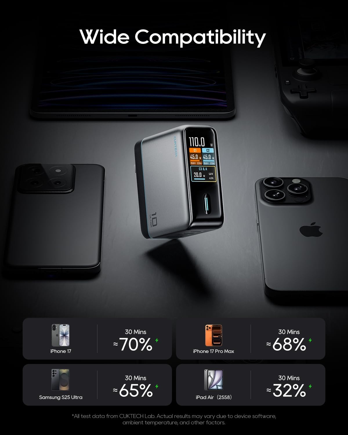 Inoltre, Cuktech ha incorporato nel caricabatterie un sistema di protezione di sicurezza a 8 livelli, che protegge da sovratensioni, cortocircuiti e altri rischi elettrici. Inoltre, è compatibile con tutti i modelli, dai MacBook, iPhone serie 17/16, e Galaxy serie S26, Pixel e altro ancora.