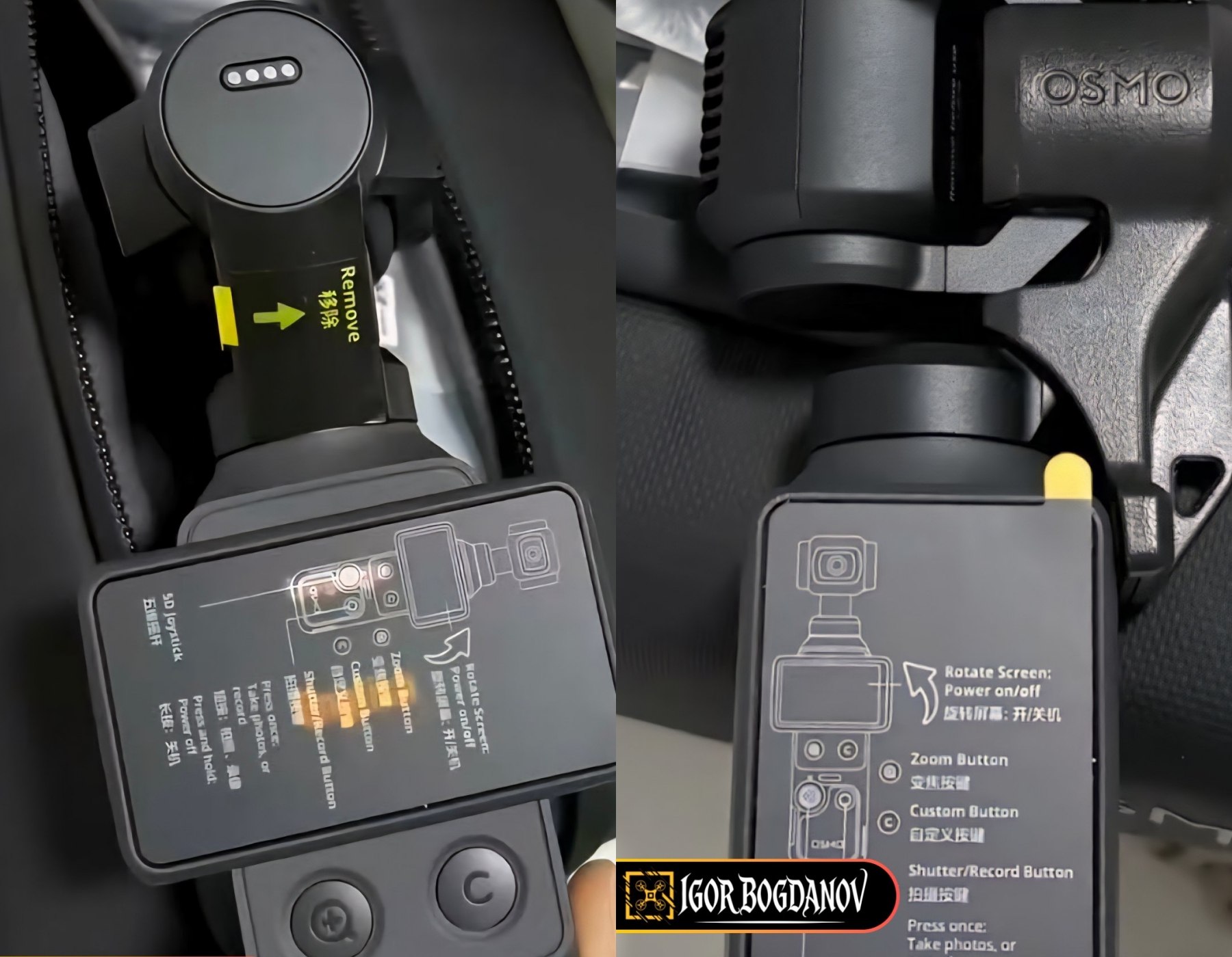 Le ultime fughe di immagini di DJI Osmo Pocket 4 (ingrandite con Gemini), mostrano il testo sugli adesivi della guida protettiva del gimbal della videocamera da vlogging, confermando la funzionalità dietro i nuovi pulsanti.