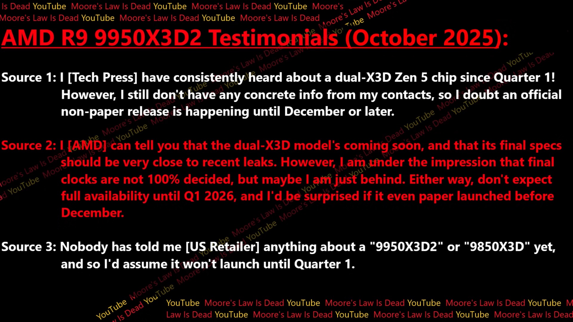 Riportando le informazioni provenienti da diverse fonti di vendita al dettaglio, AMD e "Tech Press", MLID riferisce che il lancio vero e proprio di Ryzen 9 9950X3D2 non dovrebbe avvenire prima di dicembre. Una fonte di AMD ha affermato che Ryzen 9 9950X3D2 è "in arrivo", ma la disponibilità al dettaglio non è prevista prima del primo trimestre 2026. Questa fonte ha anche confermato che le specifiche generali trapelate in precedenza dovrebbero essere "vicine alle specifiche finali". Tuttavia, AMD potrebbe apportare alcune modifiche alle velocità di clock riportate.