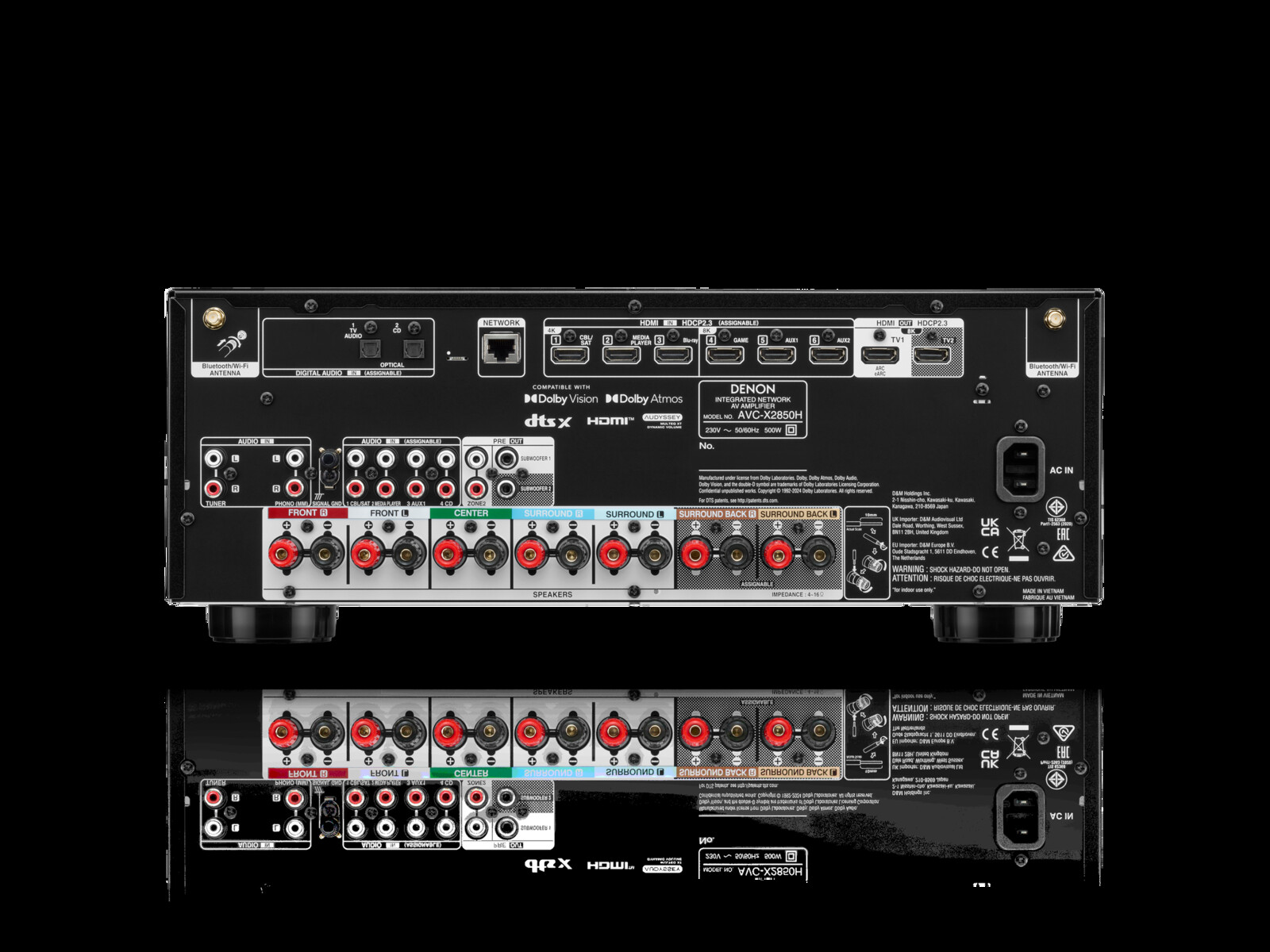 Denon sostiene che il ricevitore AV è rapidamente pronto all'uso grazie all'assistente di configurazione. Il sistema può essere messo a punto con Audyssey MultEQ XT. Sono disponibili sei porte HDMI, tre delle quali sono compatibili con l'8K e supportano anche eARC, ALLM e VRR. Inoltre, ci sono due uscite HDMI per collegare una TV e un proiettore, ad esempio.