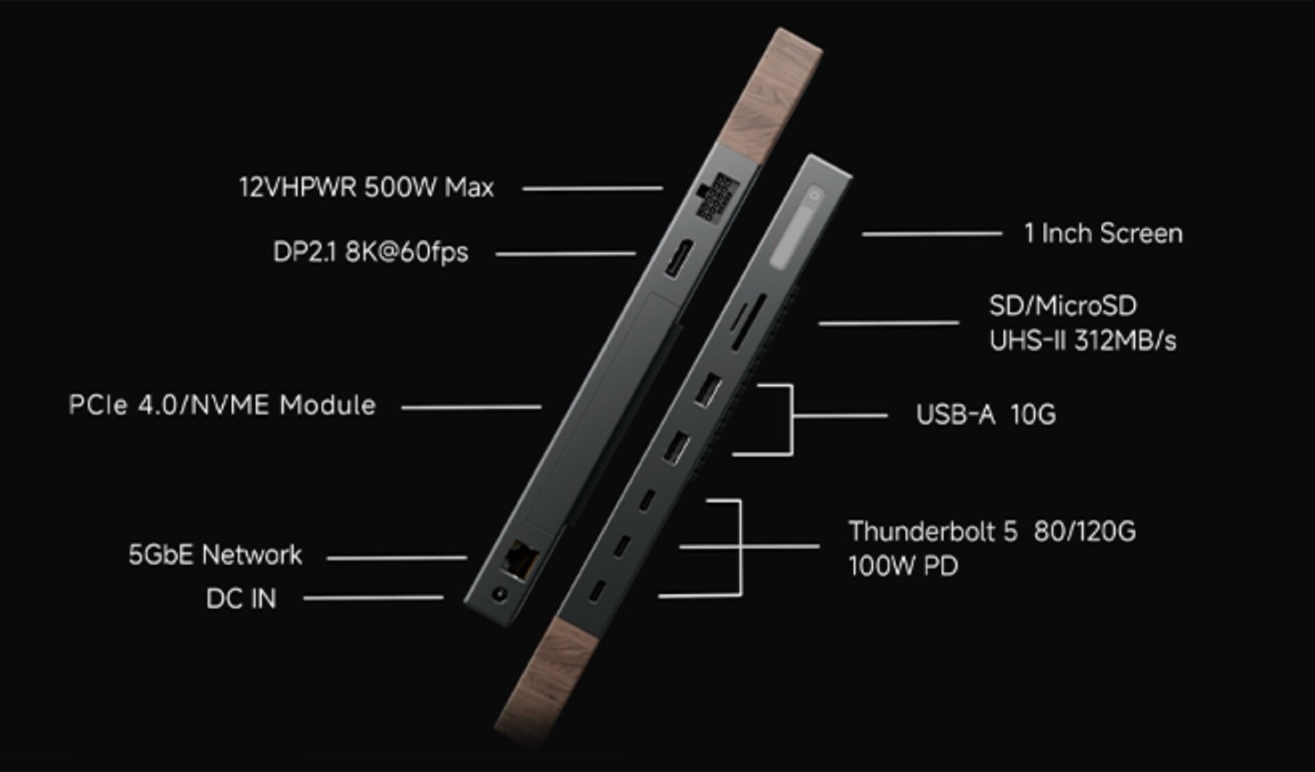 I laptop collegati possono caricare fino a 100 watt, mentre un display da 1 pollice mostra lo stato attuale del dock. La caratteristica più insolita è probabilmente lo slot PCIe nascosto sotto il coperchio sulla parte superiore, che consente all'utente di collegare una normale GPU desktop in combinazione con un alimentatore da 500 watt. La scheda grafica si collega tramite PCIe 4.0 x4.