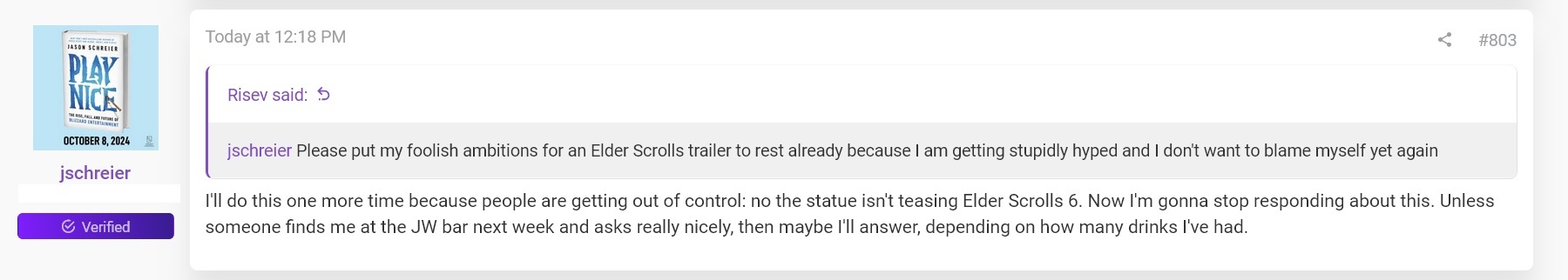 Schreier, che potrebbe sapere esattamente a cosa serve la statua, si è sentito in dovere di mettere le cose in chiaro. Sui forum di ResetEraha dichiarato: "Lo farò ancora una volta, perché le persone stanno perdendo il controllo: no, la statua non è un'anticipazione di Elder Scrolls 6. Ora smetterò di rispondere su questo argomento"