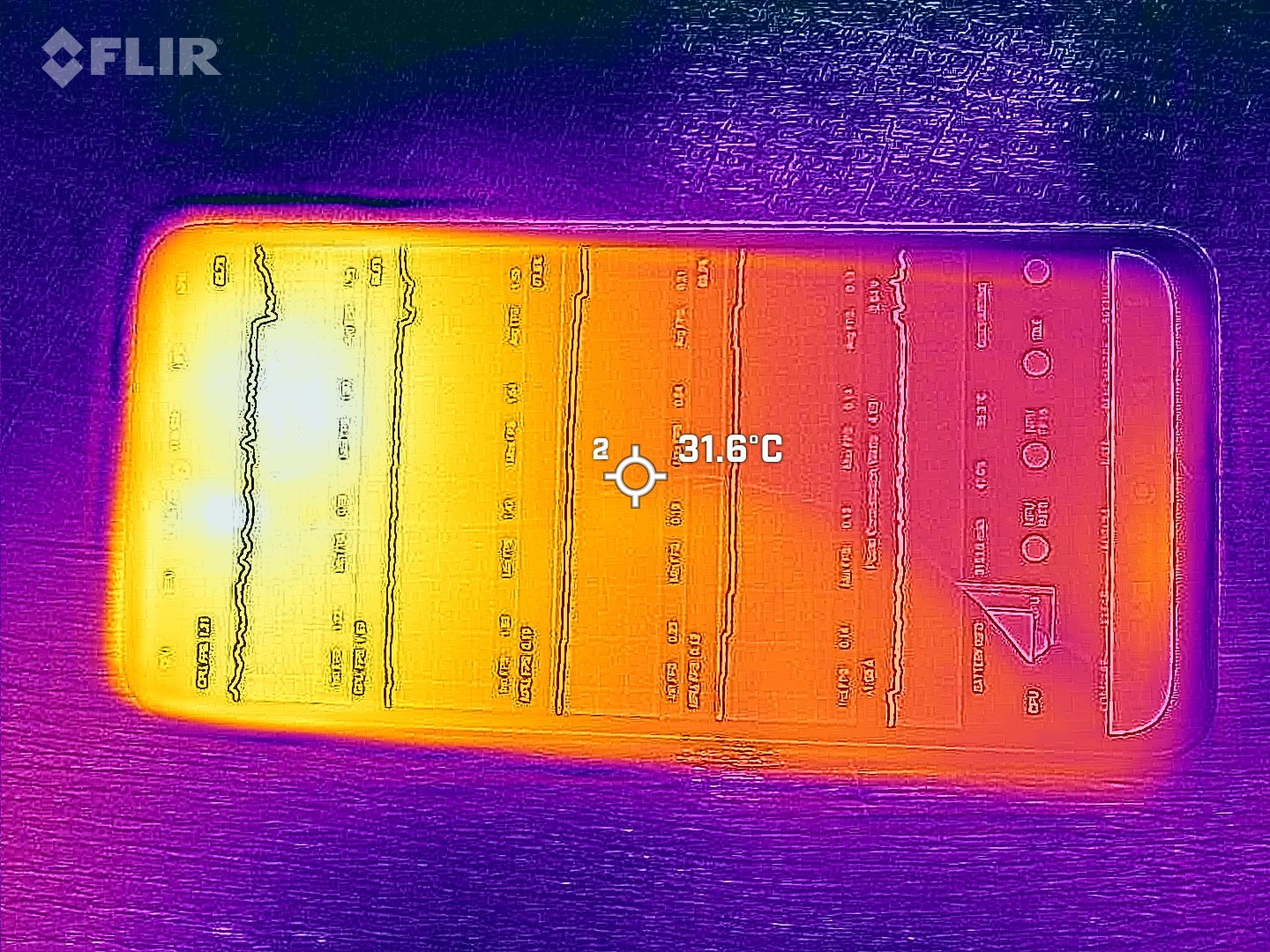 (+) In idle, la temperatura media del lato superiore è di 27.7 °C / 82 F, rispetto alla media deld ispositivo di 32.9 °C / 91 F.