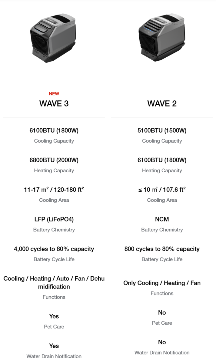 EcoFlow Wave 3 è più potente del suo predecessore, con una capacità di raffreddamento di 6.100 BTU, che si dice possa ridurre la temperatura di 15°F (~8°C) in 15 minuti. Questo significa anche che l'area di raffreddamento è più ampia, da 11 a 17 m² (~120 a 180 ft²). È possibile utilizzare il Wave 3 anche per il riscaldamento, con una capacità di riscaldamento di 6.800 BTU, commercializzata come innalzamento della temperatura di 17°F (~9°C) in 15 minuti. Le caratteristiche includono il riscaldamento automatico in base alla temperatura, la modalità deumidificatore e la modalità sleep che riduce il rumore di funzionamento a 44 dB.