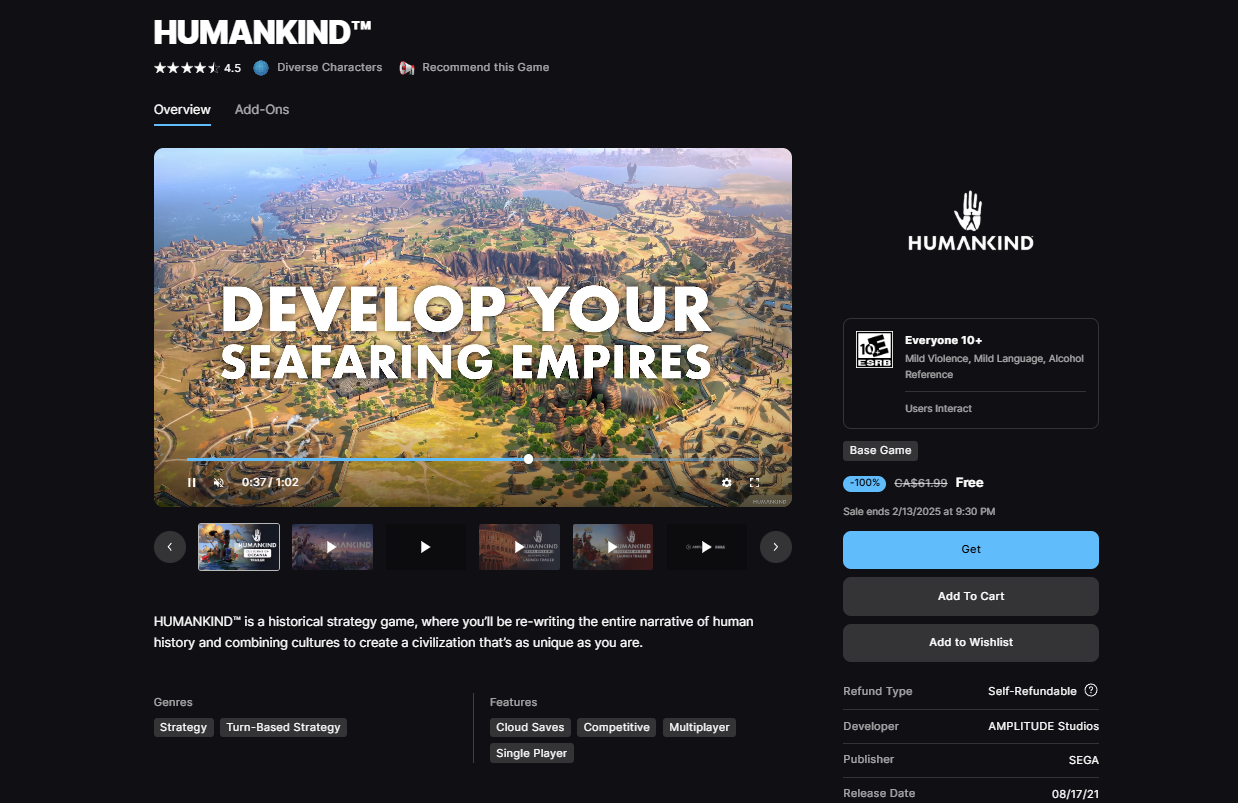 I giocatori interessati ad aggiudicarsi Humankind possono accedere ai loro account Epic Games Store e aggiungere il gioco alla loro libreria prima che l'offerta scada. Si tratta di un'opportunità limitata nel tempo, per cui si assicuri di prenderlo finché è gratis.