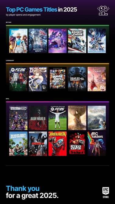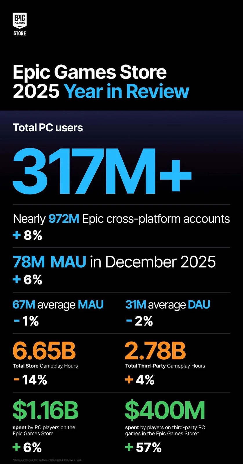 Nel 2025, l'Epic Games Store è riuscito a battere molti dei suoi stessi record: l'alternativa a Steam ha registrato 78 milioni di utenti attivi mensili lo scorso anno, che hanno speso più di 400 milioni di dollari in giochi di terze parti in totale, senza contare Fortnite. In totale, i clienti hanno trascorso 2,78 miliardi di ore di gioco con giochi di terze parti, molte delle quali probabilmente attribuibili ai giochi gratuiti settimanali.