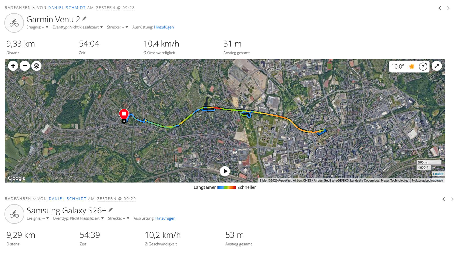 Confrontiamo il telefono Samsung con un Garmin Venu 2 durante un giro in bicicletta. Le deviazioni dal nostro percorso sono piccole nel test e, in alcuni casi, migliori di quelle del nostro smartwatch di riferimento.
