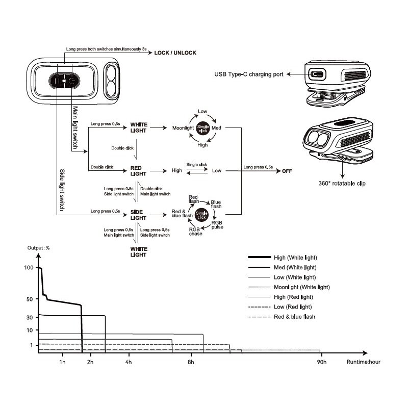 Questo permette di puntare la luce principale, composta da due LED, in direzioni diverse, a seconda delle necessità. La luce viene emessa anche con un angolo di 40 gradi, il che è utile quando viene attaccata alla tasca di una giacca o alla cinghia di uno zaino. Fornisce fino a 300 lumen o un raggio d'azione di 151 piedi. Fenix indica una durata della batteria di 1 ora e 40 minuti in questa modalità alta, ma fa notare che in questo caso si applica la regolazione della temperatura. In altre parole, i LED si oscurano se l'unità diventa troppo calda.
