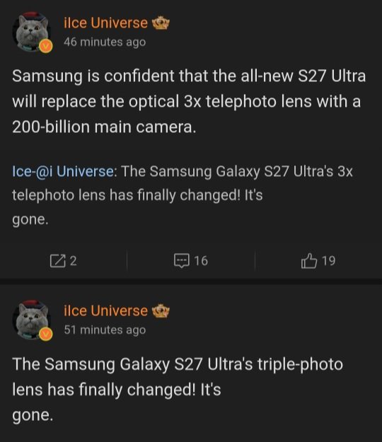 È interessante notare che questo arriva un giorno dopo che Ice Universe ha pubblicato un rendering di Galaxy S27 Ultra, chiedendo opinioni alla comunità sul design. Il rendering mostrava anche tre fotocamere sul retro. Quindi, questo ci fa pensare che il rendering di Ice Universe di Galaxy S27 Ultra potrebbe essere più di una semplice immagine creata dai fan.