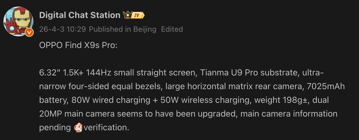 Secondo Digital Chat Station sul sito di social media cinese Weibooppo Find X9s Pro sarà dotato di un display da 6,32 pollici con una risoluzione di circa 1.5K e una frequenza di aggiornamento di 144Hz. L'informatore ha rivelato che il telefono utilizzerà un pannello Tianma U9 Pro con cornici simmetriche strette.