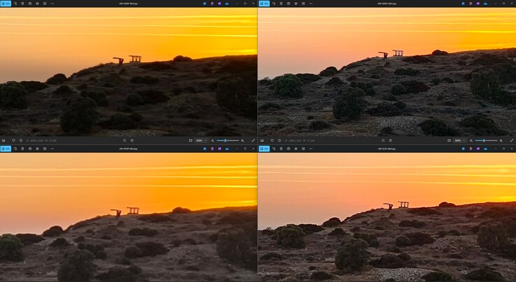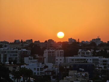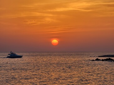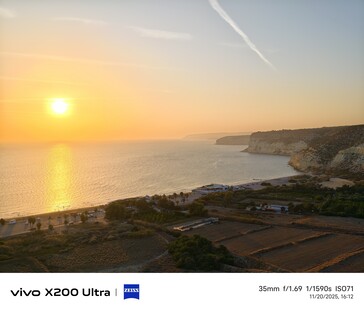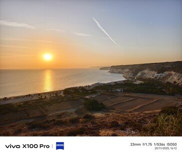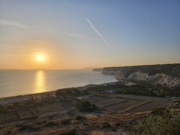Per il secondo esempio, torniamo a Kourion, guardando verso il sole al tramonto e la spiaggia di Kourion. Il sensore da 1 pollice di Vivo X100 Pro offre la resa più colorata del tramonto, ma non necessariamente la più accurata, poiché il sole non era così rosso in quel momento. Nonostante il sensore più grande e la velocità dell'otturatore più lunga, questa foto è anche la più scura.