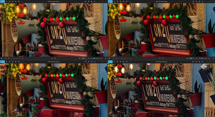 Ad un esame più attento, alcune differenze diventano evidenti nei dettagli. Lo zoom digitale di Vivo X200 Ultra da 35 mm a 50 mm sembra il più debole tra i modelli Vivo. Il testo è leggermente più leggibile sul Samsung, ma le luci appaiono eccessivamente bianche. La fotocamera principale del Vivo X300 Pro conserva la maggior parte dei dettagli senza apparire eccessivamente nitida, mentre l'X100 Pro chiaramente non trae grandi benefici dal suo sensore da 1 pollice e appare un po' troppo morbido.