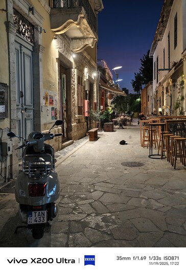 A prima vista, spiccano le luci sovraesposte di Galaxy S23 Ultra, mentre i tre modelli Vivo tengono molto meglio sotto controllo le luci. Il Vivo X200 Ultra mostra il maggior numero di dettagli negli oggetti lontani, il che non sorprende, vista la sua lunghezza focale di 35 mm. Con il senno di poi, questo risultato supporta l'allontanamento di Vivo dall'IMX989: nonostante i sensori più piccoli, il Vivo X100 Pro non riesce a tenere il passo, nemmeno a distanza ravvicinata. Ad esempio, a sinistra della moto, Vivo X300 Pro mostra più dettagli rispetto a X100 Pro e X200 Ultra.
