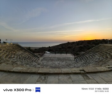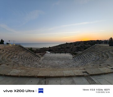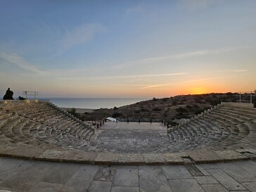 Per il secondo esempio di ultra-grandangolo, ci spostiamo a 81 chilometri di distanza, a Curium (Kourion), un antico sito archeologico con un'ottima vista sull'area circostante. A novembre, di solito non c'è molto da fare qui, quindi alcune parti del sito possono sembrare quasi deserte, come l'anfiteatro al tramonto. Questo confronto include anche il telefono Samsung del 2023 nella linea ultra-grandangolare, mostrato nell'angolo in basso a destra di ogni immagine.