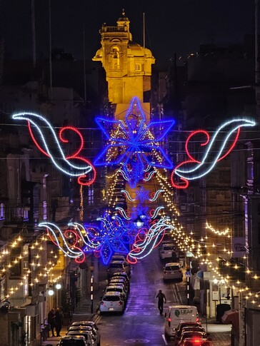 Malta prima di Natale è un'esperienza speciale. Invece della neve, molte zone della città sono caratterizzate da strade con un'illuminazione natalizia a volte molto elaborata, che consente anche un buon test in modalità notturna a mano libera - ad esempio su Triq Il-Vitorja a Senglea o lungo l'arteria principale di La Valletta, che era affollata la sera. Si tratta di condizioni piuttosto impegnative per un test con lo zoom 10x. Con un treppiede, sarebbe stato ovviamente possibile ottenere risultati significativamente migliori.