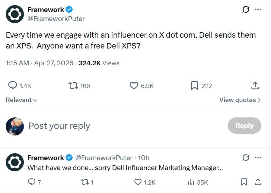 Naturalmente, i produttori di laptop affermati sembrano prendere sul serio Framework. Framework sostiene che "ogni volta che ci impegniamo con un influencer su X dot com, Dell gli invia un XPS". Il post ha ottenuto un discreto trafficocon oltre 320.000 visualizzazioni al momento della scrittura. Questo ha spinto molte persone a chiedere scherzosamente a Framework di interagire con loro nella speranza di ricevere un XPS da Dell.