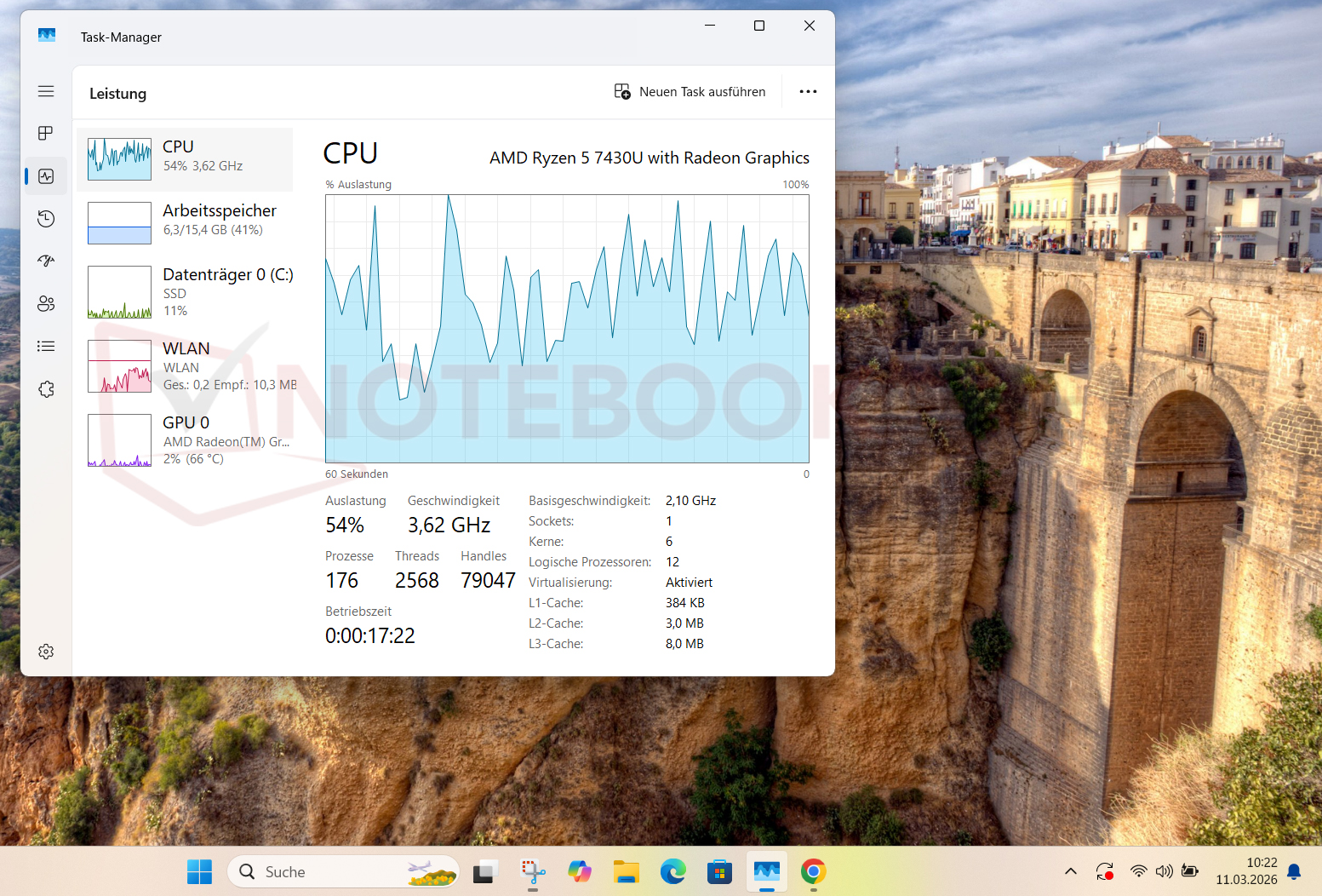 Il Task Manager di Windows fornisce una prima indicazione. Qui è possibile visualizzare sia le frequenze di clock che le cache della CPU. Il Ryzen 5 7430U ha un boost clock massimo di 4.300 MHz e 16 MB di cache L3 e proviene dalla serie di processori Zen 3, con il nome in codice "Barcelo-U". Nel task manager del nostro campione, tuttavia, le informazioni sono diverse. Sebbene il nome della CPU sia indicato come Ryzen 5 7430U, il nome in codice "Lucienne-U" (architettura Zen 2), la cache L3 di 2x 4MB e il clock turbo osservabile di massimo poco più di 4.000 MHz indicano incongruenze. Queste specifiche corrispondono al Chip Ryzen 5 5500U.